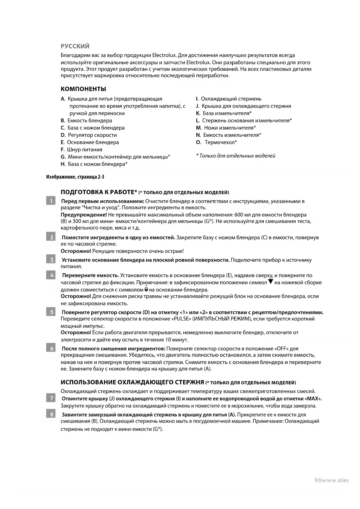 4 Переверните емкость. Установите емкость в основание блендера (Е), надавив сверху, и поверните по часовой стрелке до фиксации. Примечание: в зафиксированном положении символ на ножевой сборке должен совместиться с символом на основании блендера. Осторожно! Для снижения риска травмы не устанавливайте режущий блок на основание блендера, если не зафиксирована емкость. 5 Поверните регулятор скорости (D) на отметку «1» или «2» в соответствии с рецептом/предпочтениями. Переведите селектор скорости в положение «PULSE» (ИМПУЛЬСНЫЙ РЕЖИМ), если требуется короткий мощный импульс. Осторожно! Если работа двигателя прерывается, немедленно выключите блендер, отключите от электросети и дайте ему остыть в течение 10минут. 6 После полного смешения ингредиентов: Поверните селектор скорости в положение «OFF» для прекращения смешивания. Убедитесь, что двигатель полностью остановился, а затем снимите емкость, нажав на нее и повернув против часовой стрелки. Снимите емкость с основания блендера и переверните ее. Замените базу с ножом блендера на крышку для питья (А). ИСПОЛЬЗОВАНИЕ ОХЛАЖДАЮЩЕГО СТЕРЖНЯ (* ТОЛЬКО ДЛЯ ОТДЕЛЬНЫХ МОДЕЛЕЙ) Охлаждающий стержень охлаждает и поддерживает температуру ваших свежеприготовленных смесей. 7 Отвинтите крышку (J) охлаждающего стержня (I) и наполните ее водопроводной водой до отметки «MAX». Закрутите крышку обратно на охлаждающий стержень и поместите ее в морозильник, чтобы вода замерзла. 8 Завинтите замерзший охлаждающий стержень в крышку для питья (А). Прикрепите ее к емкости для смешивания (В). Охлаждающий стержень можно мыть в посудомоечной машине. Примечание: Охлаждающий стержень не подходит к мини-емкости (G*).97www.electrolux.com