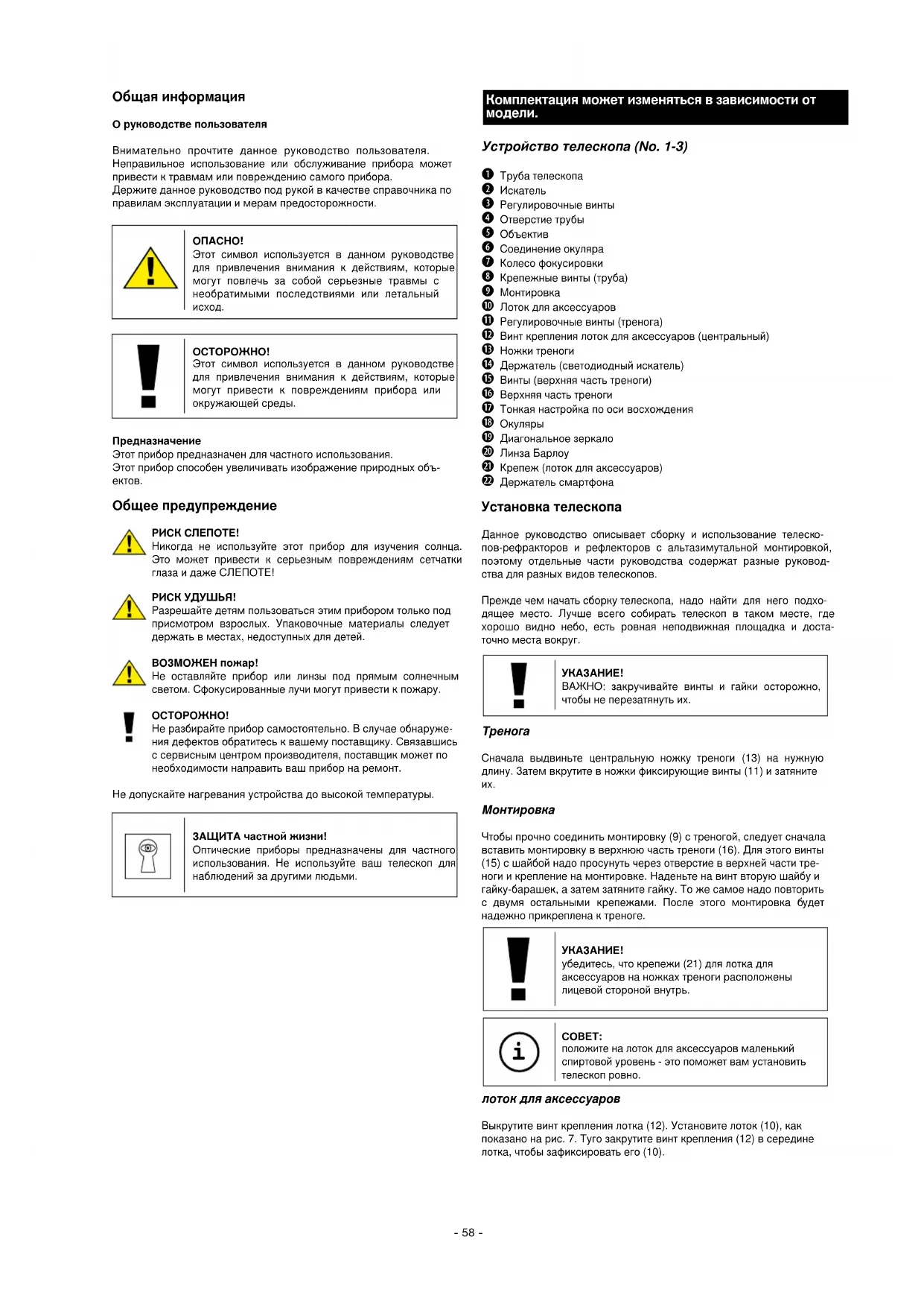 Не разбирайте прибор самостоятельно. В случае обнаруже- ния дефектов обратитесь к вашему поставщику. Связавшись с сервисным центром производителя, поставщик может по необходимости направить ваш прибор на ремонт. Не допускайте нагревания устройства до высокой температуры. ЗАЩИТА частной жизни! Оптические приборы предназначены для частного использования. Не используйте ваш телескоп для наблюдений за другими людьми. Комплектация может изменяться в зависимости от