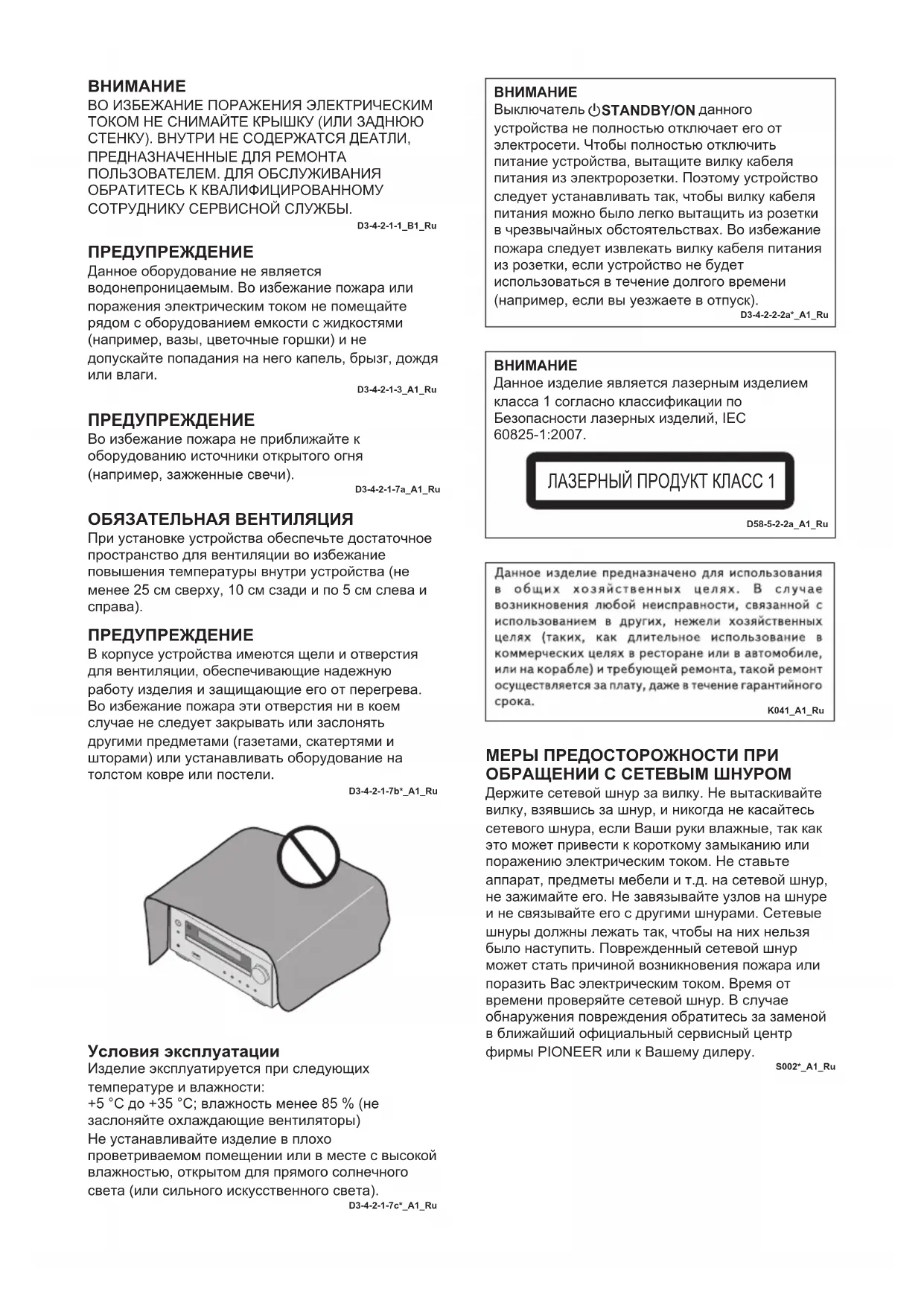 - Accessoires Afstandsbediening . . . . . . . . . . . . . . . . . . . . . . . . . . . . . . . 1AAA-batterijen (R03) . . . . . . . . . . . . . . . . . . . . . . . . . . . . . 2AM-antennekabel*1 . . . . . . . . . . . . . . . . . . . . . . . . . . . . . . 1FM-draadantenne*2. . . . . . . . . . . . . . . . . . . . . . . . . . . . . . 1DAB/FM-draadantenne*3 . . . . . . . . . . . . . . . . . . . . . . . . . 1Netsnoer . . . . . . . . . . . . . . . . . . . . . . . . . . . . . . . . . . . . . . 1Garantiebewijs*4 . . . . . . . . . . . . . . . . . . . . . . . . . . . . . . . . 1Handleiding (dit document) . . . . . . . . . . . . . . . . . . . . . . . . 1*1 Alleen Noord-Amerikaanse modellen*2 alleen X-HM16/HM26*3 alleen X-HM26D*4 Alleen Europese modellen Opmerking• De specificaties zijn van toepassing wanneer de voeding 230 V is.• De technische gegevens en het ontwerp kunnen met het oog op verbeteringen zonder voorafgaande kennisgeving worden gewijzigd. “Pioneer” is een handelsmerk van Pioneer Corporation en wordt gebruikt onder licentie. © 2016 Onkyo & Pioneer Corporation. Alle rechten voorbehouden. X-HM16_26_26D_Nl.book 34 ページ 2016年7月22日 金曜日 午前10時42分SN29402699_X-HM16_26_26D_En_European.book 39 ページ 2016年7月21日 木曜日 午前10時20分ВНИМАНИЕ ВО ИЗБЕЖАНИЕ ПОРАЖЕНИЯ ЭЛЕКТРИЧЕСКИМ ТОКОМ НЕ СНИМАЙТЕ КРЫШКУ (ИЛИ ЗАДНЮЮ СТЕНКУ). ВНУТРИ НЕ СОДЕРЖАТСЯ ДЕАТЛИ, ПРЕДНАЗНАЧЕННЫЕ ДЛЯ РЕМОНТА ПОЛЬЗОВАТЕЛЕМ. ДЛЯ ОБСЛУЖИВАНИЯ ОБРАТИТЕСЬ К КВАЛИФИЦИРОВАННОМУ СОТРУДНИКУ СЕРВИСНОЙ СЛУЖБЫ.D3-4-2-1-1_B1_Ru ПРЕДУПРЕЖДЕНИЕ Данное оборудование не является водонепроницаемым. Во избежание пожара или поражения электрическим током не помещайте рядом с оборудованием емкости с жидкостями (например, вазы, цветочные горшки) и не допускайте попадания на него капель, брызг, дождя или влаги.D3-4-2-1-3_A1_Ru ОБЯЗАТЕЛЬНАЯ ВЕНТИЛЯЦИЯ При установке устройства обеспечьте достаточное пространство для вентиляции во избежание повышения температуры внутри устройства (не менее 25 см сверху, 10 см сзади и по 5 см слева и справа). ПРЕДУПРЕЖДЕНИЕ В корпусе устройства имеются щели и отверстия для вентиляции, обеспечивающие надежную работу изделия и защищающие его от перегрева. Во избежание пожара эти отверстия ни в коем случае не следует закрывать или заслонять другими предметами (газетами, скатертями и шторами) или устанавливать оборудование на толстом ковре или постели.D3-4-2-1-7b*_A1_Ru Условия эксплуатации Изделие эксплуатируется при следующих температуре и влажности:+5 °C до +35 °C; влажность менее 85 % (не заслоняйте охлаждающие вентиляторы)Не устанавливайте изделие в плохо проветриваемом помещении или в месте с высокой влажностью, открытом для прямого солнечного света (или сильного искусственного света).D3-4-2-1-7c*_A1_RuВНИМАНИЕДанное изделие является лазерным изделием класса 1 согласно классификации по Безопасности лазерных изделий, IEC 60825-1:2007. ЛАЗЕРНЫЙ ПРОДУКТ КЛАСС 1 D58-5-2-2a_A1_RuK041_A1_Ru МЕРЫ ПРЕДОСТОРОЖНОСТИ ПРИ ОБРАЩЕНИИ С СЕТЕВЫМ ШНУРОМ Держите сетевой шнур за вилку. Не вытаскивайте вилку, взявшись за шнур, и никогда не касайтесь сетевого шнура, если Ваши руки влажные, так как это может привести к короткому замыканию или поражению электрическим током. Не ставьте аппарат, предметы мебели и т.д. на сетевой шнур, не зажимайте его. Не завязывайте узлов на шнуре и не связывайте его с другими шнурами. Сетевые шнуры должны лежать так, чтобы на них нельзя было наступить. Поврежденный сетевой шнур может стать причиной возникновения пожара или поразить Вас электрическим током. Время от времени проверяйте сетевой шнур. В случае обнаружения повреждения обратитесь за заменой в ближайший официальный сервисный центр фирмы PIONEER или к Вашему дилеру.S002*_A1_Ru ПРЕДУПРЕЖДЕНИЕ Во избежание пожара не приближайте к оборудованию источники открытого огня (например, зажженные свечи). D3-4-2-1-7a_A1_RuВНИМАНИЕВыключатель STANDBY/ON данного устройства не полность