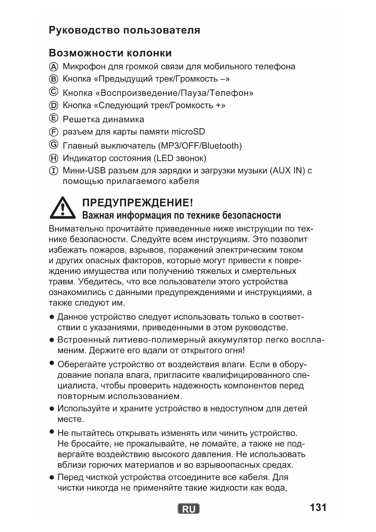 Мини-USB разъем для зарядки и загрузки музыки (AUX IN) с помощью прилагаемого кабеля ПРЕДУПРЕЖДЕНИЕ! Важная информация по технике безопасности Внимательно прочитайте приведенные ниже инструкции по тех- нике безопасности. Следуйте всем инструкциям. Это позволит избежать пожаров, взрывов, поражений электрическим током и других опасных факторов, которые могут привести к повре- ждению имущества или получению тяжелых и смертельных травм. Убедитесь, что все пользователи этого устройства ознакомились с данными предупреждениями и инструкциями, а также следуют им.
