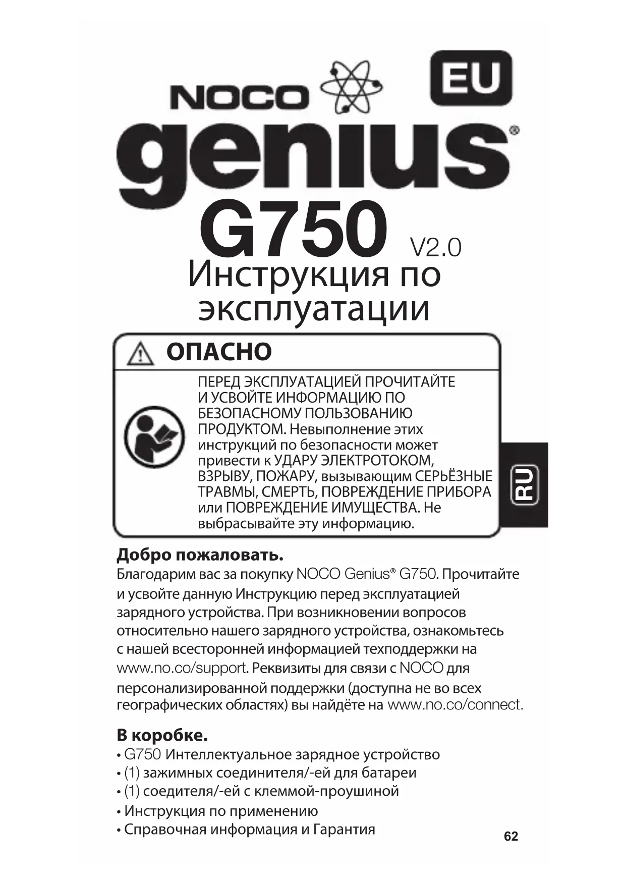 Добро пожаловать. Благодарим вас за покупку NOCO Genius® G750. Прочитайте и усвойте данную Инструкцию перед эксплуатацией зарядного устройства. При возникновении вопросов относительно нашего зарядного устройства, ознакомьтесь с нашей всесторонней информацией техподдержки на www.no.co/support. Реквизиты для связи с NOCO для персонализированной поддержки (доступна не во всех географических областях) вы найдёте на www.no.co/connect.