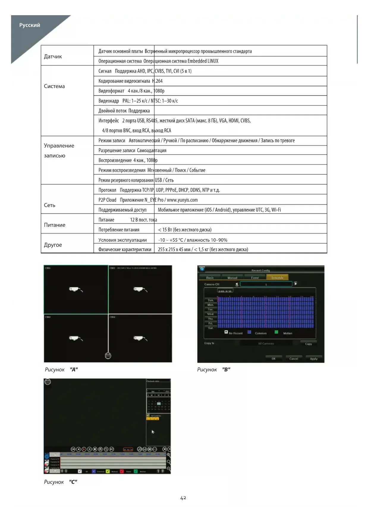 Zobrazí fyzickou adresu aktuálního síťového rozhraní (nelze upravit). Více síťových karet potřebných k nastavení výchozího směrovače, může navštívit externí síť prostřednictvím tohoto kanálu. 41Датчик основной платы Встроенный микропроцессор промышленного стандарта Операционная система Операционная система Embedded LINUX Сигнал Поддержка AHD, IPC, CVBS, TVI, CVI (5 в 1) Кодирование видеосигнала H.264 Видеоформат 4 кан./8 кан., 1080p Видеокадр PAL: 1–25 к/с / NTSC: 1–30 к/с Двойной поток Поддержка Интерфейс 2 порта USB, RS485, жесткий диск SATA (макс. 8 ГБ), VGA, HDMI, CVBS, 4/8 портов BNC, вход RCA, выход RCA Режим записи Автоматический / Ручной / По расписанию / Обнаружение движения / Запись по тревоге Разрешение записи Самоадаптация Воспроизведение 4 кан., 1080p Режим воспроизведения Мгновенный / Поиск / Событие Режим резервного копирования USB / Сеть Протокол Поддержка TCP/IP, UDP, PPPoE, DHCP, DDNS, NTP и т.д. P2P Cloud Приложение N_EYE Pro / www.yunyis.com Поддерживаемый доступ Мобильное приложение (iOS / Android), управление UTC, 3G, Wi-Fi Питание 12 В пост. тока Потребление питания < 15 Вт (без жесткого диска) Условия эксплуатации -10 – +55 °C / влажность 10–90% Физические характеристики 255 x 215 x 45 мм / < 1,5 кг (без жесткого диска)