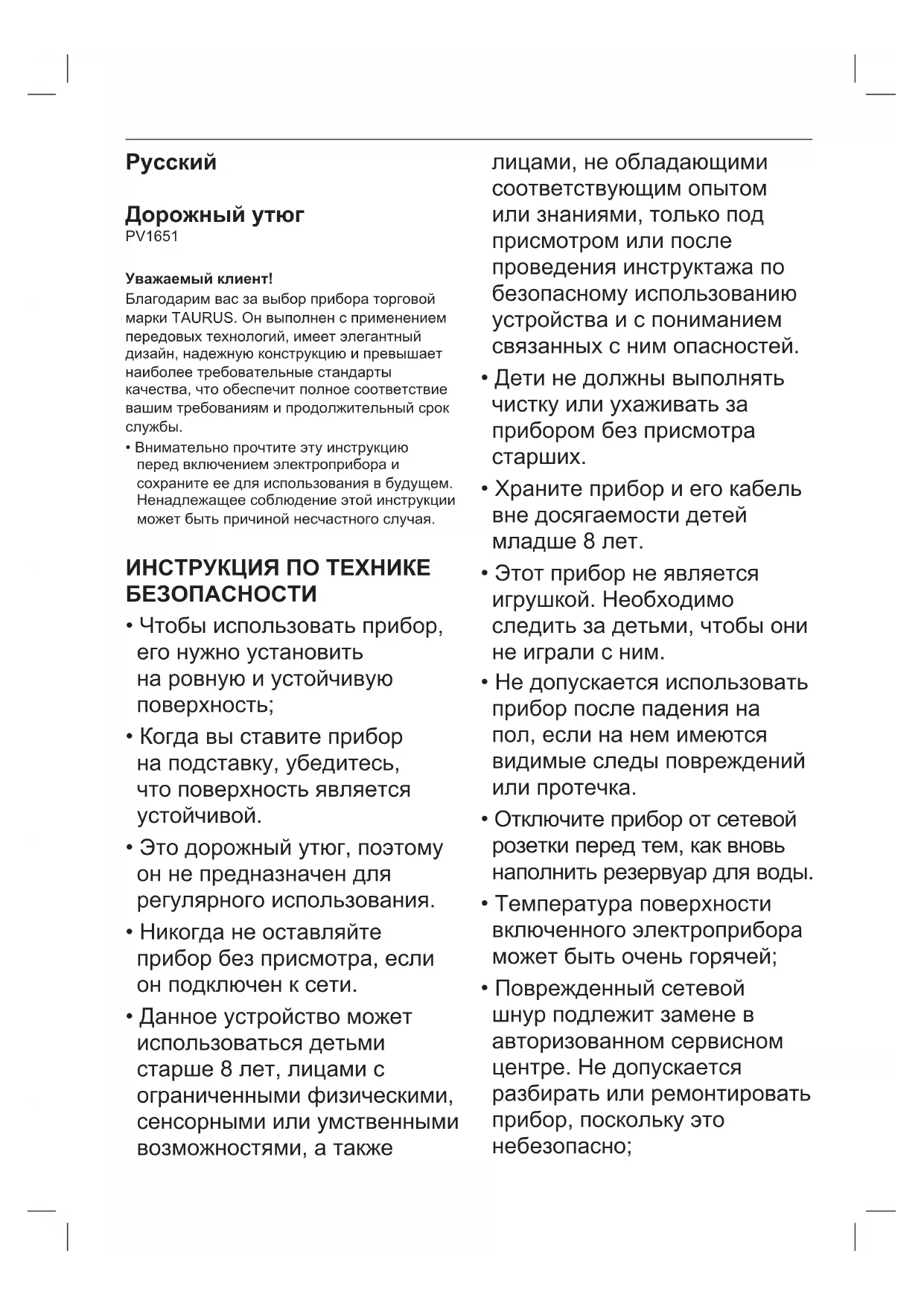 - В изделии нет веществ в концентрациях, которые считаются вредными для окружающей среды. Этот значок означает, что после окончания срока службы для утилизации электроприбора отнесите его в пункт сбора электрических и электронных отходов (WEEE) Этот символ означает, что поверхность может сильно нагреваться во время использования. Этот прибор выполнен в соответствии с Директивой по низковольтному оборудованию 2014/35/EU, Директивой по электромагнитной совместимости 2014/30/EU, Директивой 2011/65/EU, ограничивающей использование некоторых опасных веществ в электрическом и электронном оборудовании, а также Директивой 2009/125/EC по экологическим требованиям к изделиям, потребляющим энергию.Română Fier de călcat pentru voiaj Viaggo PV1651 Stimate client, Vă mulţumim pentru că aţi cumpărat un produs marca TAURUS. Datorită tehnologiei sale, designului şi modului de funcţionare, precum şi faptului că depăşeşte cele mai stricte standarde de calitate, se poate garanta o utilizare complet satisfăcătoare şi de lungă durată a produsului.