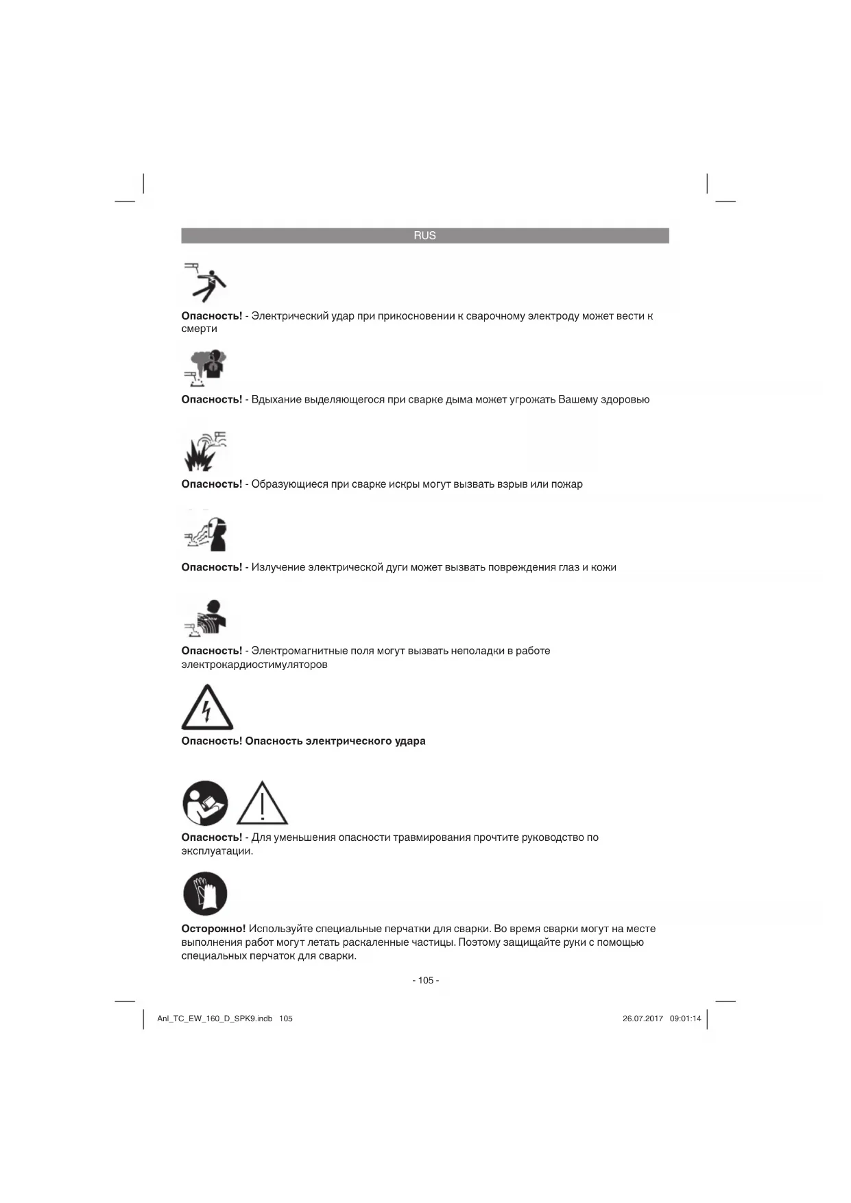 Опасность! - Вдыхание выделяющегося при сварке дыма может угрожать Вашему здоровью Опасность! - Излучение электрической дуги может вызвать повреждения глаз и кожи Опасность! - Образующиеся при сварке искры могут вызвать взрыв или пожар Опасность! - Электромагнитные поля могут вызвать неполадки в работе электрокардиостимуляторов Опасность! Опасность электрического удара Опасность! - Для уменьшения опасности травмирования прочтите руководство по эксплуатации. Осторожно! Используйте специальные перчатки для сварки. Во время сварки могут на месте выполнения работ могут летать раскаленные частицы. Поэтому защищайте руки с помощью специальных перчаток для сварки. Anl_TC_EW_160_D_SPK9.indb 105Anl_TC_EW_160_D_SPK9.indb 105 26.07.2017 09:01:1426.07.2017 09:01:14RUS