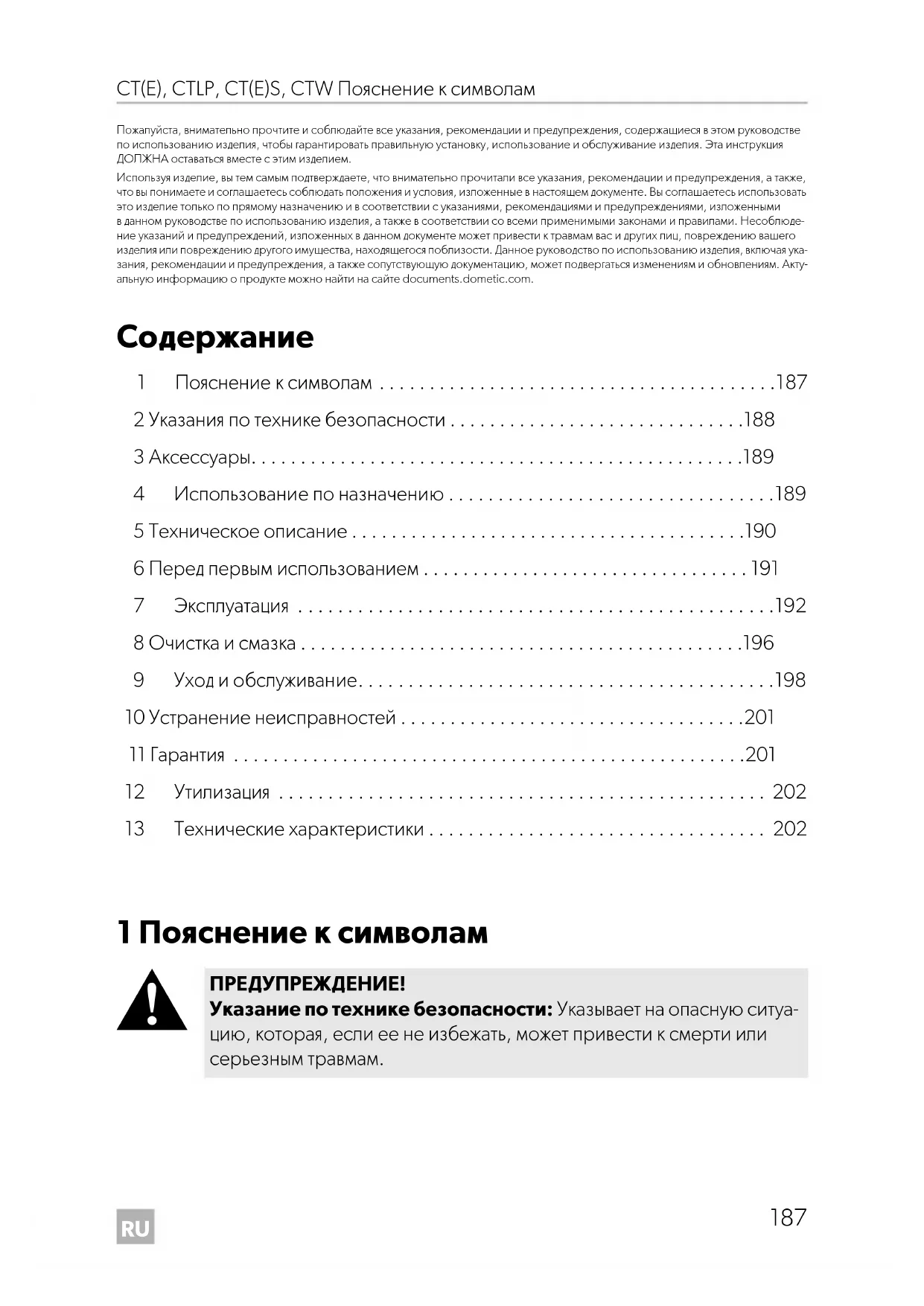 ПРЕДУПРЕЖДЕНИЕ! Указание по технике безопасности: Указывает на опасную ситуа- цию, которая, если ее не избежать, может привести к смерти или серьезным травмам.RU Указания по технике безопасности CT(E), CTLP, CT(E)S, CTW