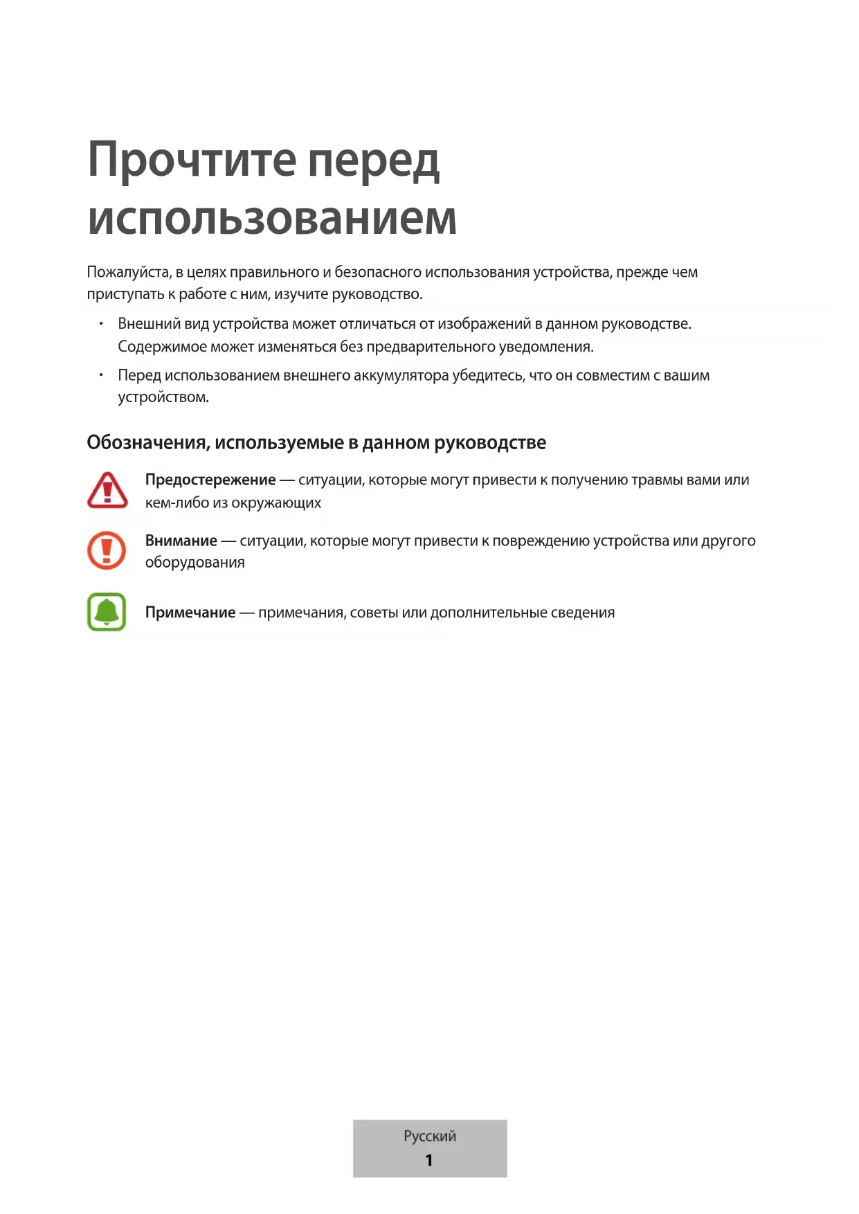 Перед использованием внешнего аккумулятора убедитесь, что он совместим с вашим устройством. Обозначения, используемые в данном руководстве Предостережение — ситуации, которые могут привести к получению травмы вами или кем-либо из окружающих Внимание — ситуации, которые могут привести к повреждению устройства или другого оборудования Примечание — примечания, советы или дополнительные сведения