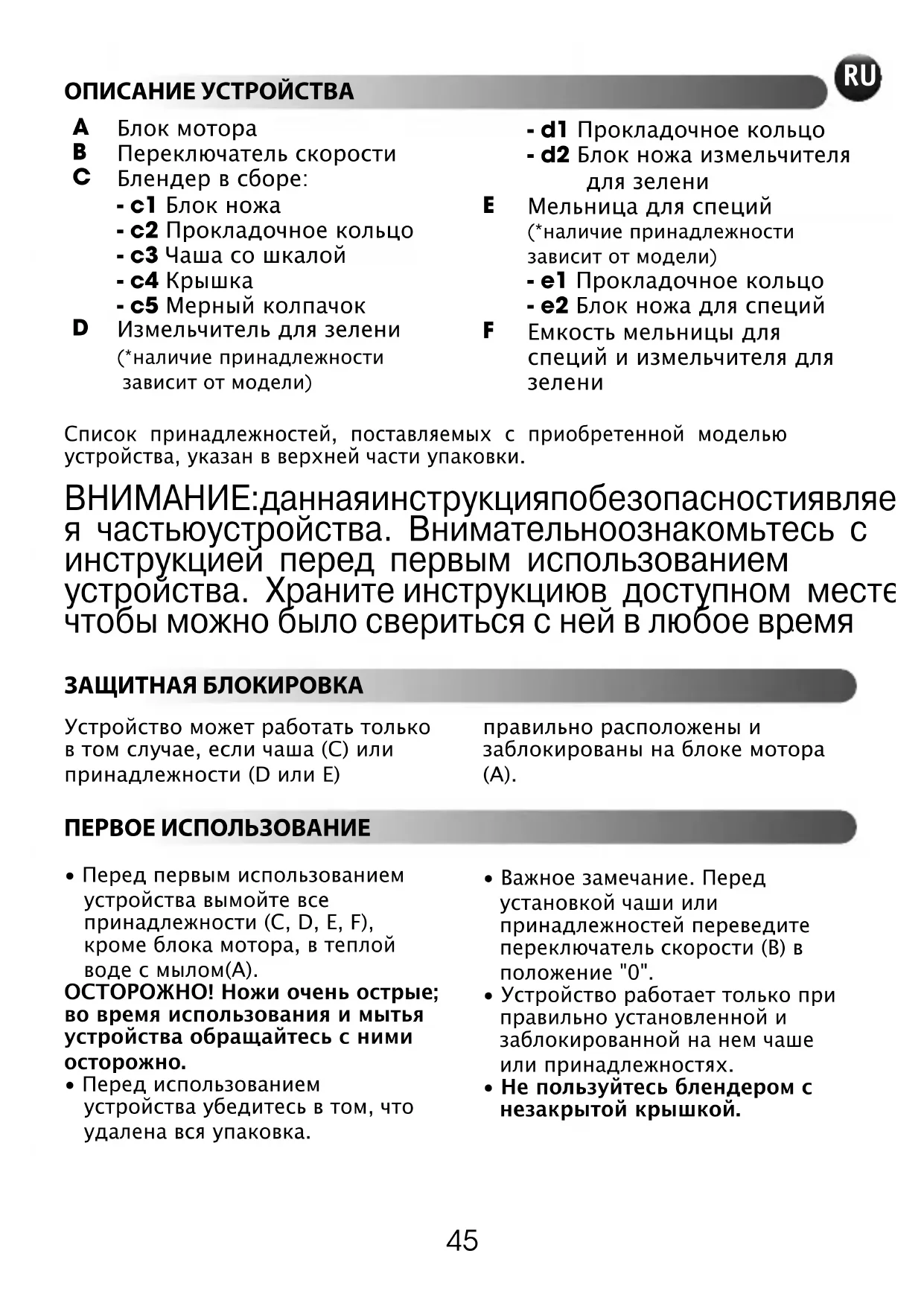 - Перед первым использованиемустройства вымойте всепринадлежности (C, D, E, F),кроме блока мотора, в теплойводе с мылом(A).ОСТОРОЖНО! Ножи очень острые;во время использования и мытьяустройства обращайтесь с нимиосторожно.• Перед использованиемустройства убедитесь в том, чтоудалена вся упаковка. • Важное замечание. Передустановкой чаши илипринадлежностей переведитепереключатель скорости (B) вположение "0".• Устройство работает только приправильно установленной изаблокированной на нем чашеили принадлежностях.• Не пользуйтесь блендером снезакрытой крышкой.