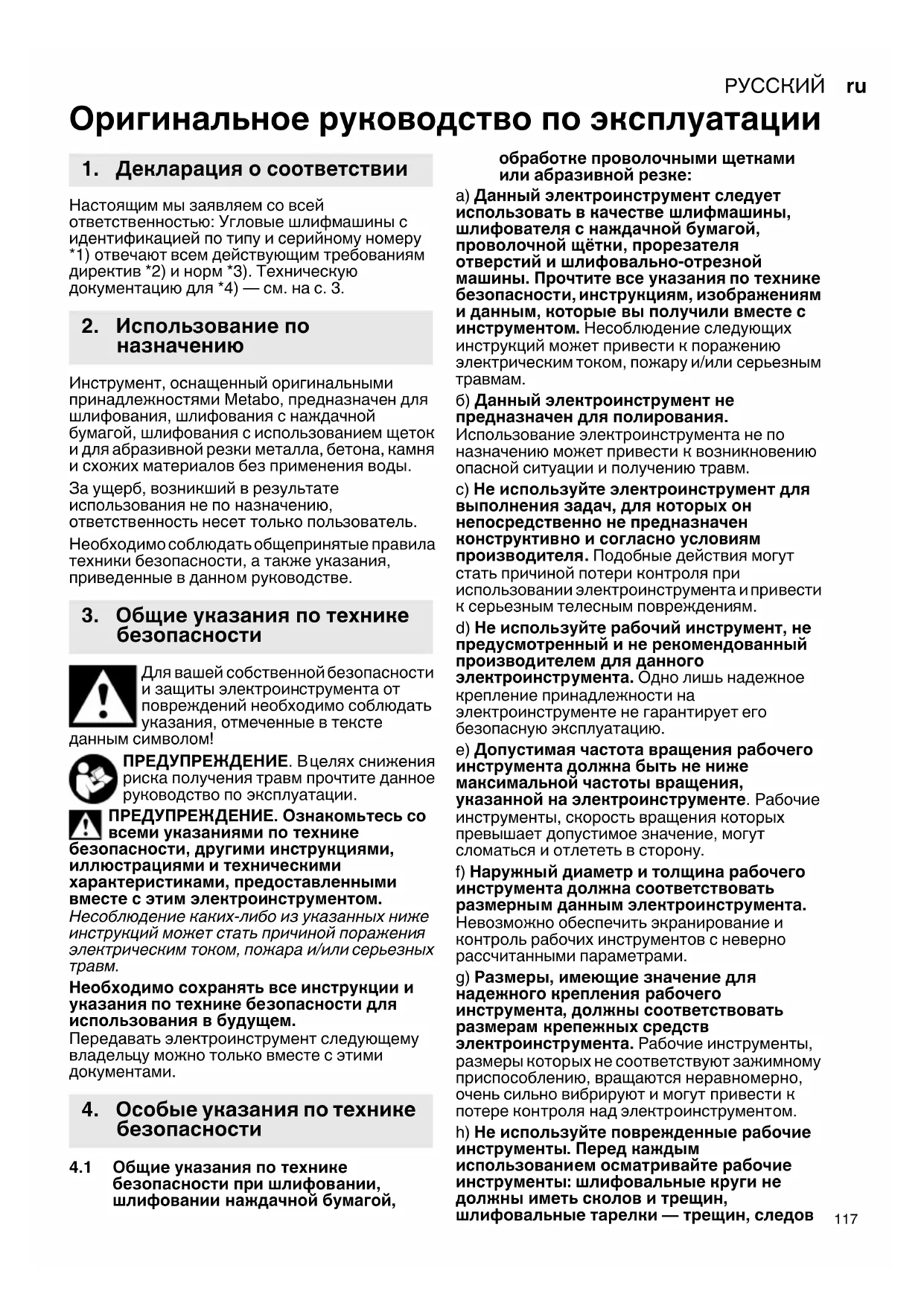 Оригинальное руководство по эксплуатации Настоящим мы заявляем со всей ответственностью: Угловые шлифмашины с идентификацией по типу и серийному номеру *1) отвечают всем действующим требованиям директив *2) и норм *3). Техническую документацию для *4) — см. на с. 3. Инструмент, оснащенный оригинальными принадлежностями Metabo, предназначен для шлифования, шлифования с наждачной бумагой, шлифования с использованием щеток и для абразивной резки металла, бетона, камня и схожих материалов без применения воды. За ущерб, возникший в результате использования не по назначению, ответственность несет только пользователь. Необходимо соблюдать общепринятые правила техники безопасности, а также указания, приведенные в данном руководстве. Для вашей собственной безопасности и защиты электроинструмента от повреждений необходимо соблюдать указания, отмеченные в тексте данным символом! ПРЕДУПРЕЖДЕНИЕ. В целях снижения риска получения травм прочтите данное руководство по эксплуатации. ПРЕДУПРЕЖДЕНИЕ. Ознакомьтесь со всеми указаниями по технике безопасности, другими инструкциями, иллюстрациями и техническими характеристиками, предоставленными вместе с этим электроинструментом. Несоблюдение каких-либо из указанных ниже инструкций может стать причиной поражения электрическим током, пожара и/или серьезных