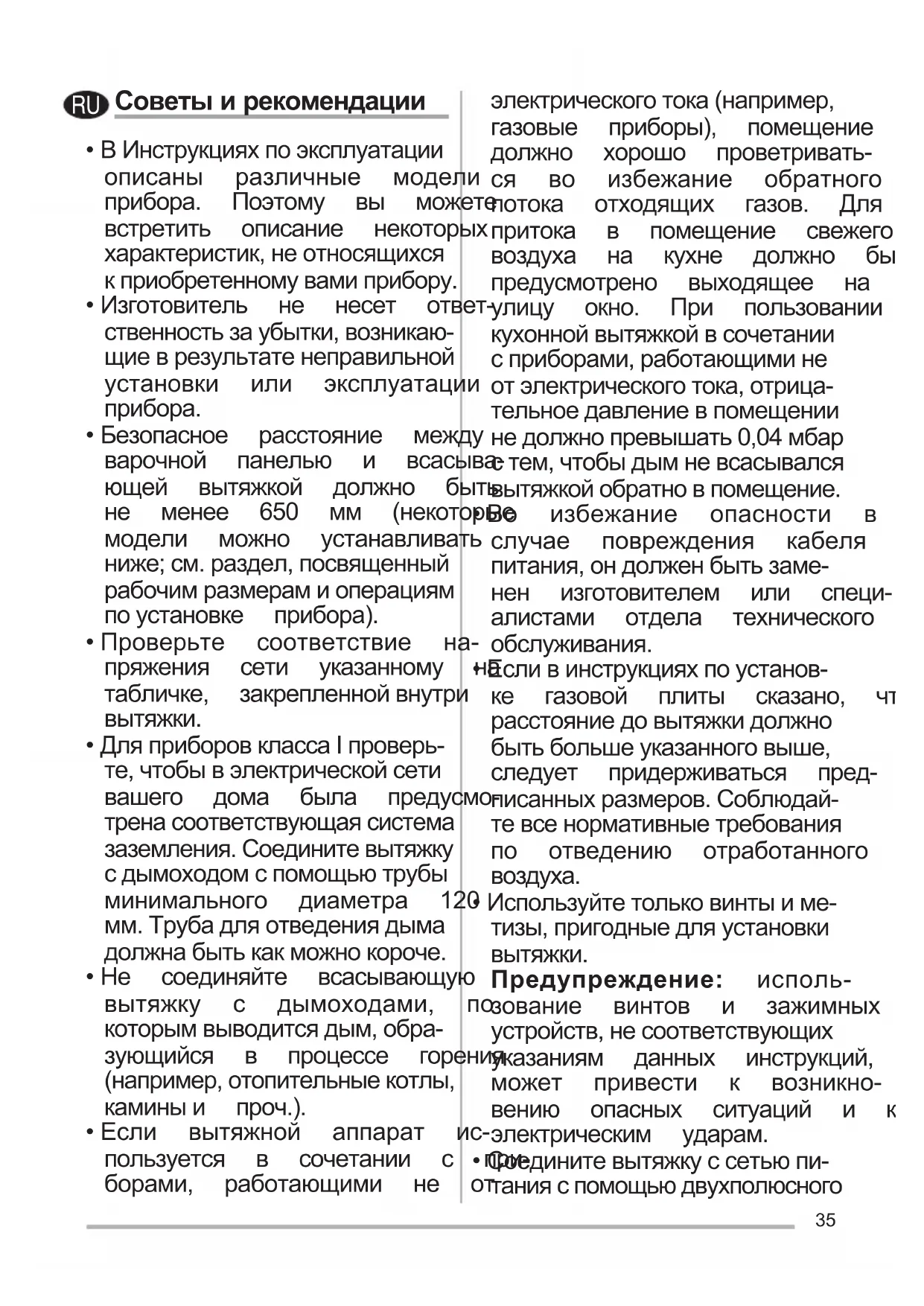 - ДляприборовклассаIпроверь- те,чтобывэлектрическойсети вашего дома была предусмо- тренасоответствующаясистема заземления.Соединитевытяжку сдымоходомспомощьютрубы минимального диаметра 120 мм.Трубадляотведениядыма должнабытькакможнокороче.