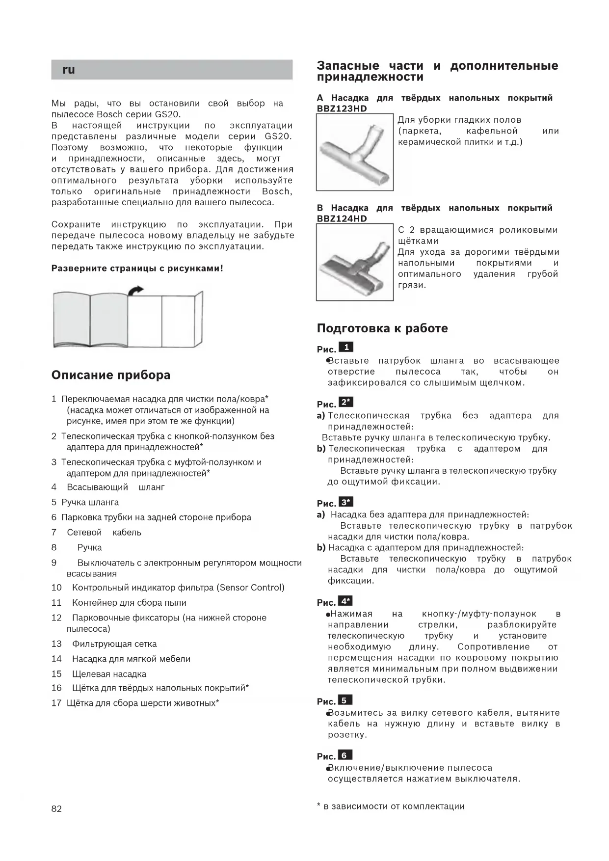 Не използвайте препарат за грубо абразивно почистване, препарат за стъкло или универсален почистващ препарат. Никога не потапяйте прахосмукачката във вода. Правото на технически изменения е запазено.82 Мы рады, что вы остановили свой выбор на пылесосе Bosch серии GS20. В настоящей инструкции по эксплуатации представлены различные модели серии GS20. Поэтому возможно, что некоторые функции и принадлежности, описанные здесь, могут отсутствовать у вашего прибора. Для достижения оптимального результата уборки используйте только оригинальные принадлежности Bosch, разработанные специально для вашего пылесоса. Сохраните инструкцию по эксплуатации. При передаче пылесоса новому владельцу не забудьте передать также инструкцию по эксплуатации. Разверните страницы с рисунками! Описание прибора 1 Переключаемая насадка для чистки пола/ковра* (насадка может отличаться от изображенной на рисунке, имея при этом те же функции) 2 Телескопическая трубка с кнопкой-ползунком без адаптера для принадлежностей* 3 Телескопическая трубка с муфтой-ползунком и адаптером для принадлежностей* 4 Всасывающий шланг 5 Ручка шланга 6 Парковка трубки на задней стороне прибора 7 Сетевой кабель 8 Ручка 9 Выключатель с электронным регулятором мощности