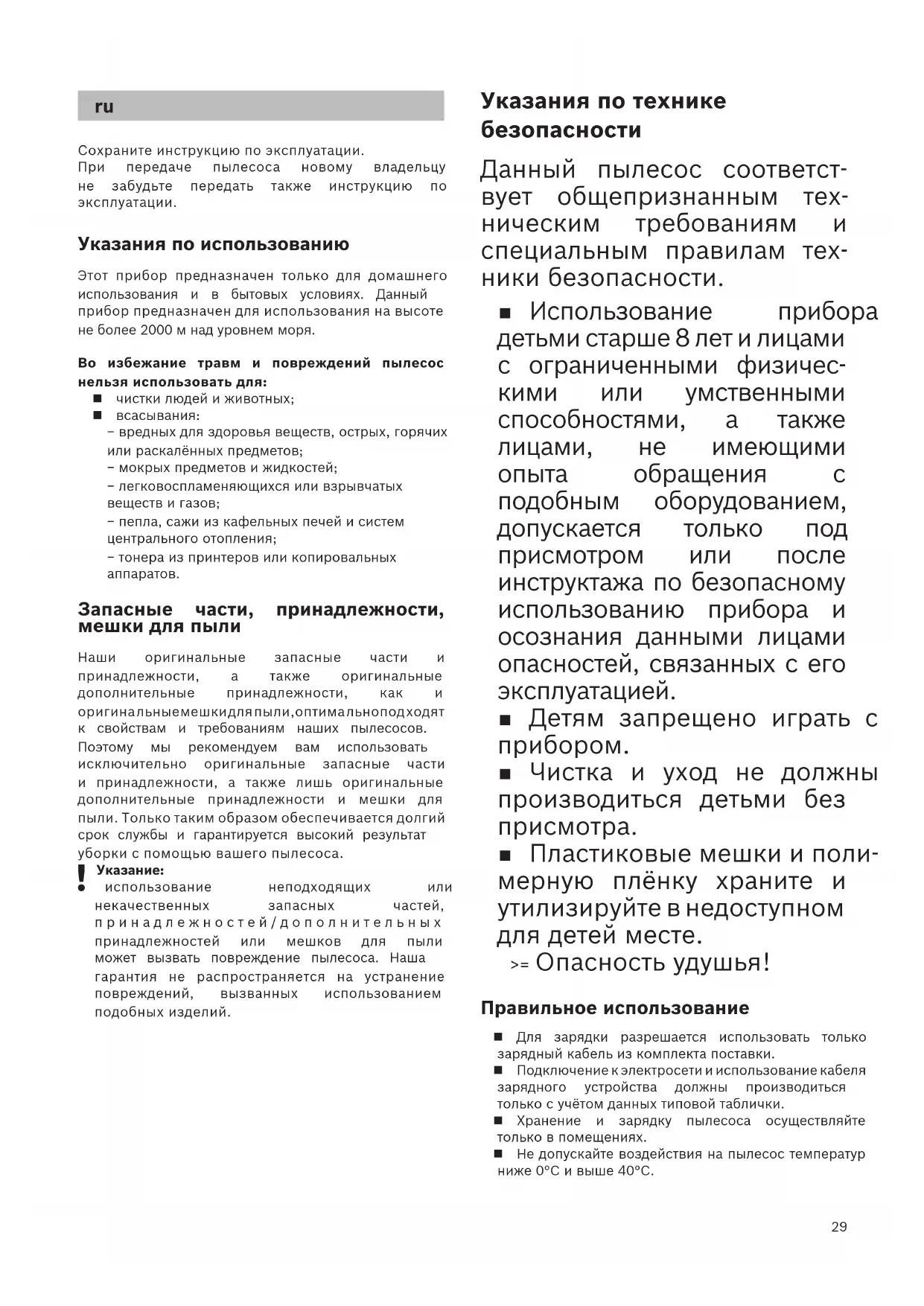 Сохраните инструкцию по эксплуатации.При передаче пылесоса новому владельцу не забудьте передать также инструкцию по эксплуатации. Указания по использованию Этот прибор предназначен только для домашнего использования и в бытовых условиях. Данный прибор предназначен для использования на высоте не более 2000 м над уровнем моря. Во избежание травм и повреждений пылесос нельзя использовать для: чистки людей и животных; всасывания: − вредных для здоровья веществ, острых, горячих или раскалённых предметов; − мокрых предметов и жидкостей; − легковоспламеняющихся или взрывчатых веществ и газов; − пепла, сажи из кафельных печей и систем центрального отопления; − тонера из принтеров или копировальных аппаратов. Запасные части, принадлежности, мешки для пыли Наши оригинальные запасные части и принадлежности, а также оригинальные дополнительные принадлежности, как и оригина льные мешки для пыли, оптима льно под ходят к свойствам и требованиям наших пылесосов. Поэтому мы рекомендуем вам использовать исключительно оригинальные запасные части и принадлежности, а также лишь оригинальные дополнительные принадлежности и мешки для пыли. Только таким образом обеспечивается долгий срок службы и гарантируется высокий результат уборки с помощью вашего пылесоса. Указание: использование неподходящих или некачественных запасных частей, принадлежностей/дополнительных принадлежностей или мешков для пыли может вызвать повреждение пылесоса. Наша гарантия не распространяется на устранение повреждений, вызванных использованием подобных изделий. Указания по технике безопасности Данный пылесос соответст- вует общепризнанным тех- ническим требованиям и специальным правилам тех- ники безопасности. Использование прибора детьми старше 8 лет и лицами с ограниченными физичес- кими или умственными способностями, а также лицами, не имеющими опыта обращения с подобным оборудованием, допускается только под присмотром или после инструктажа по безопасному использованию прибора и осознания данными лицами опасностей, связанных с его эксплуатацией. Детям запрещено играть с