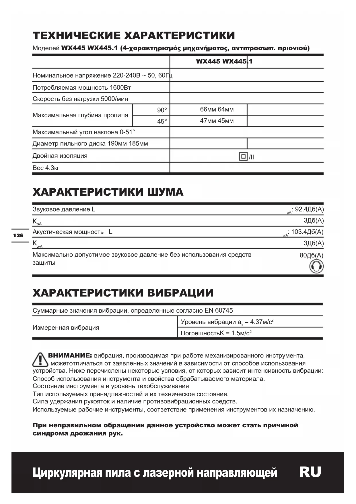 WX445 WX445.1 Номинальное напряжение 220-240В ~ 50, 60Гц Потребляемая мощность 1600Вт Скорость без нагрузки 5000/мин Максимальная глубина пропила 90° 66мм 64мм 45° 47мм 45мм Максимальный угол наклона 0-51° Диаметр пильного диска 190мм 185мм Двойная изоляция /II Вес 4.3кг