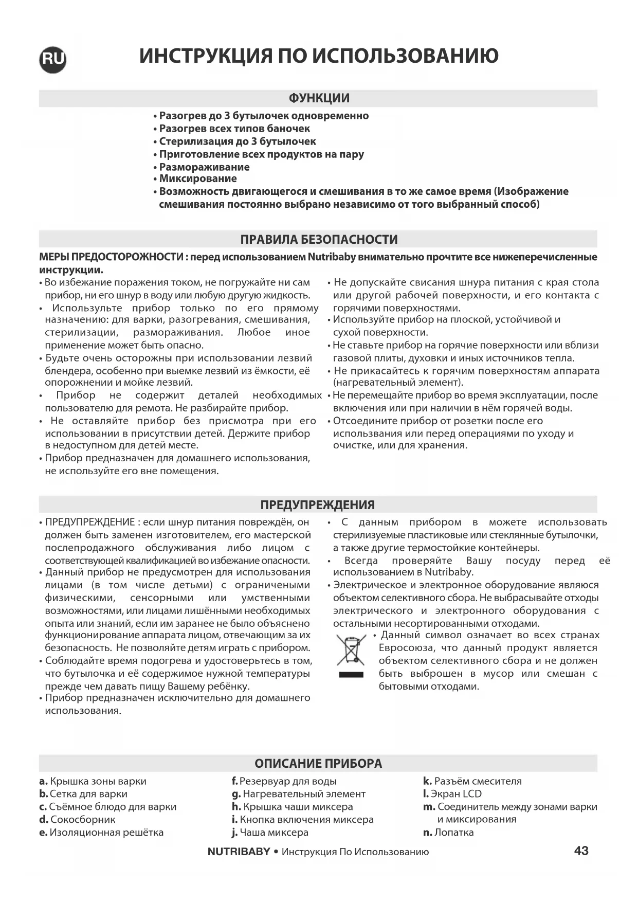 - Данный символ означает во всех странах Евросоюза, что данный продукт является объектом селективного сбора и не должен быть выброшен в мусор или смешан с бытовыми отходами. ПРАВИЛА БЕЗОПАСНОСТИ МЕРЫ ПРЕДОСТОРОЖНОСТИ : перед использованием Nutribaby внимательно прочтите все нижеперечисленные инструкции.