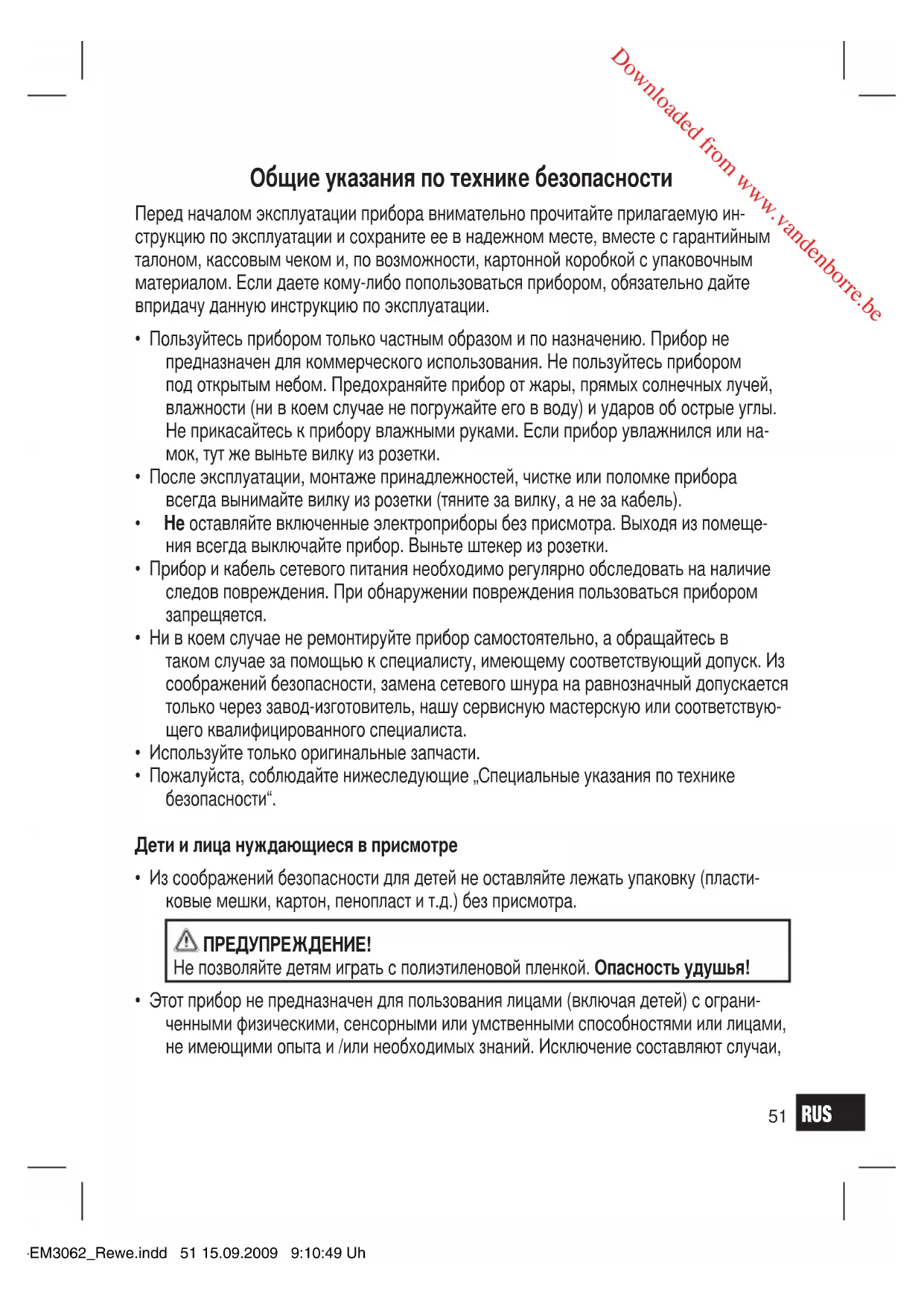 - Этот прибор не предназначен для пользования лицами (включая детей) с ограни- ченными физическими, сенсорными или умственными способностями или лицами, не имеющими опыта и /или необходимых знаний. Исключение составляют случаи, 05-EM3062_Rewe.indd 51 15.09.2009 9:10:49 Uhr Downloaded from www.vandenborre.beRUS