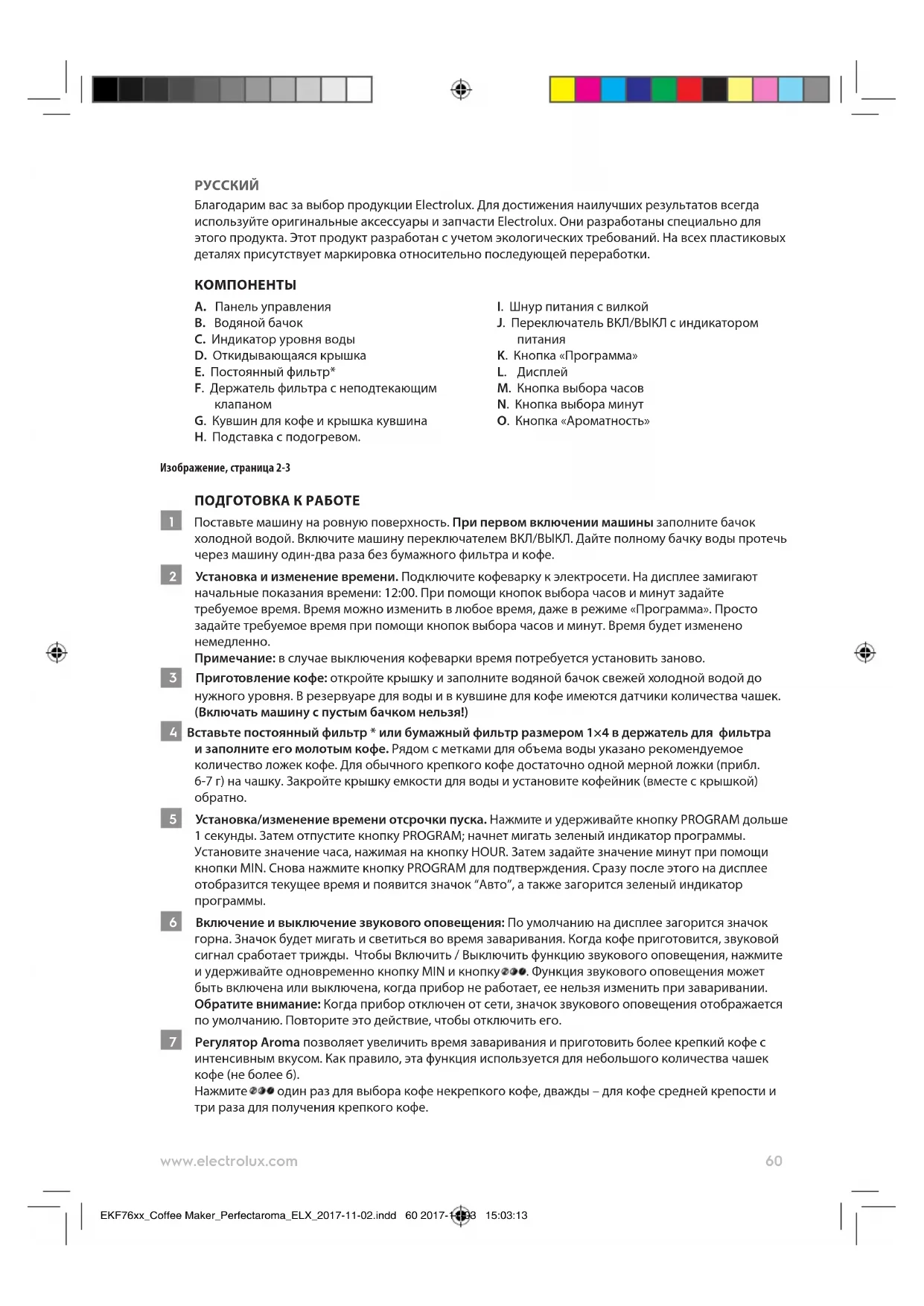 - Не пользуйтесь устройством при повреждении шнура питания или корпуса. EKF76xx_Coffee Maker_Perfectaroma_ELX_2017-11-02.indd 61 2017-11-03 15:03:1362 www.electrolux.com