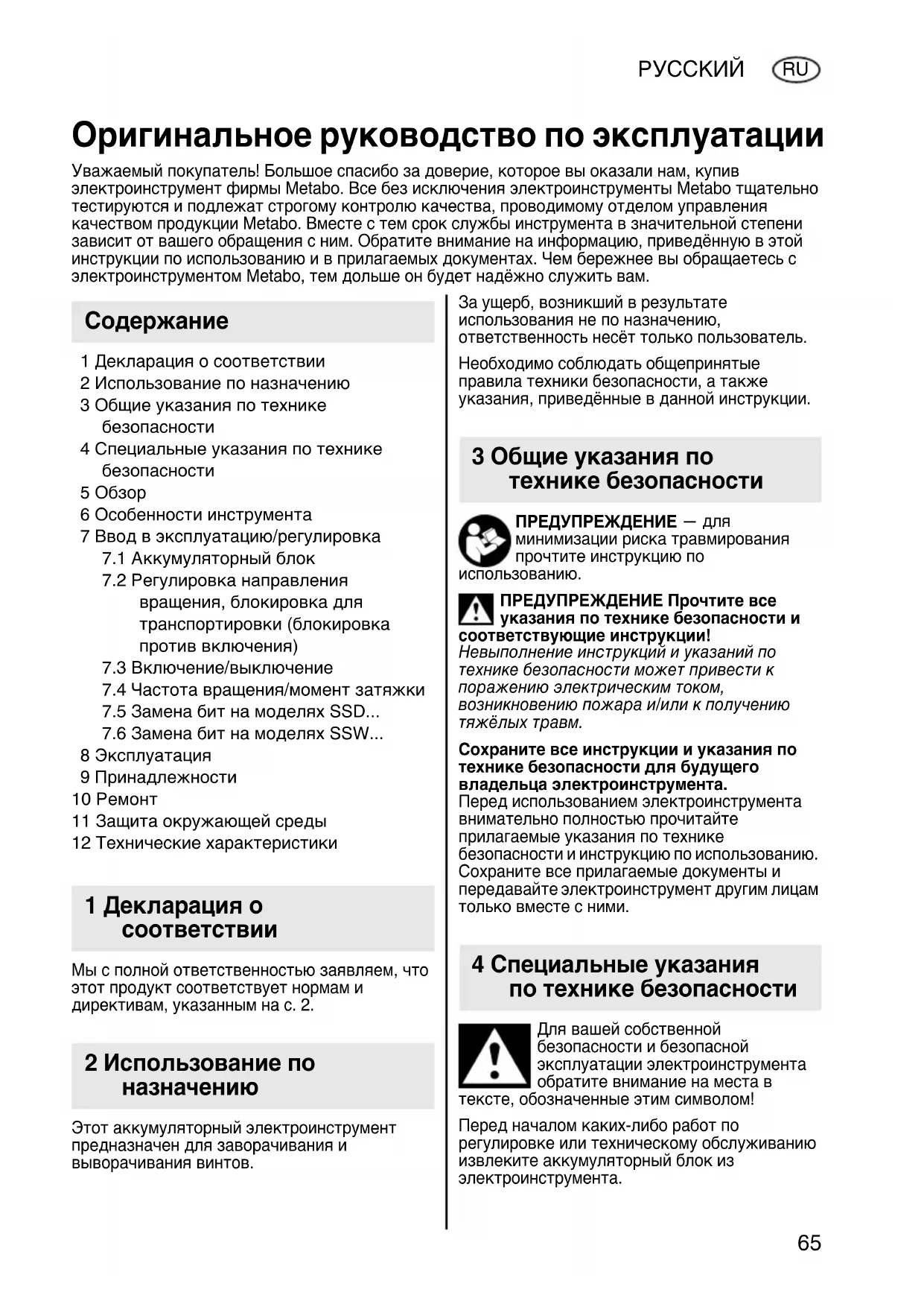 1 Декларация о соответствии 2 Использование по назначению 3 Общие указания по технике безопасности 4 Специальные указания по технике безопасности 5 Обзор 6 Особенности инструмента 7 Ввод в эксплуатацию/регулировка