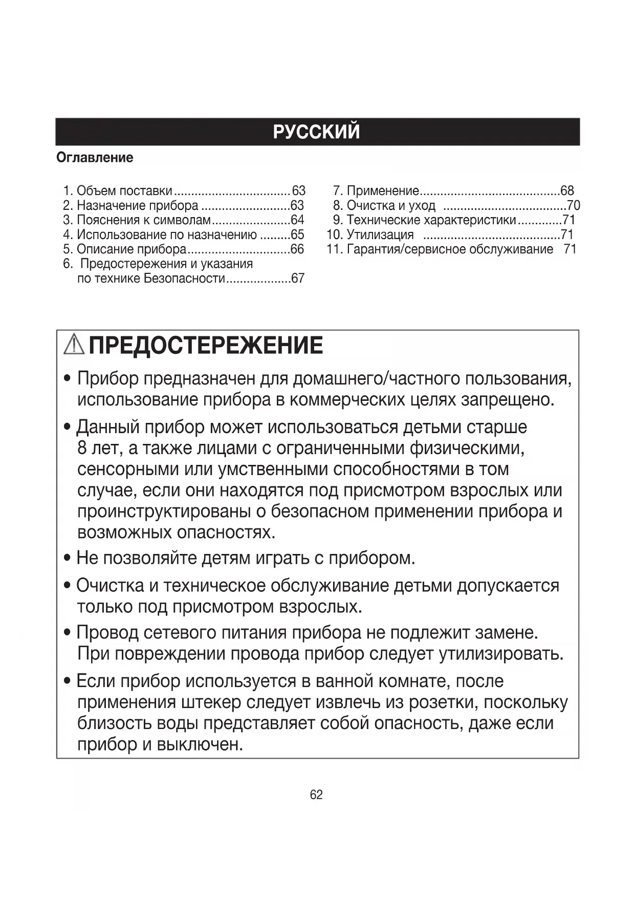 - Данный прибор может использоваться детьми старше 8 лет, а также лицами с ограниченными физическими, сенсорными или умственными способностями в том случае, если они находятся под присмотром взрослых или проинструктированы о безопасном применении прибора и возможных опасностях.