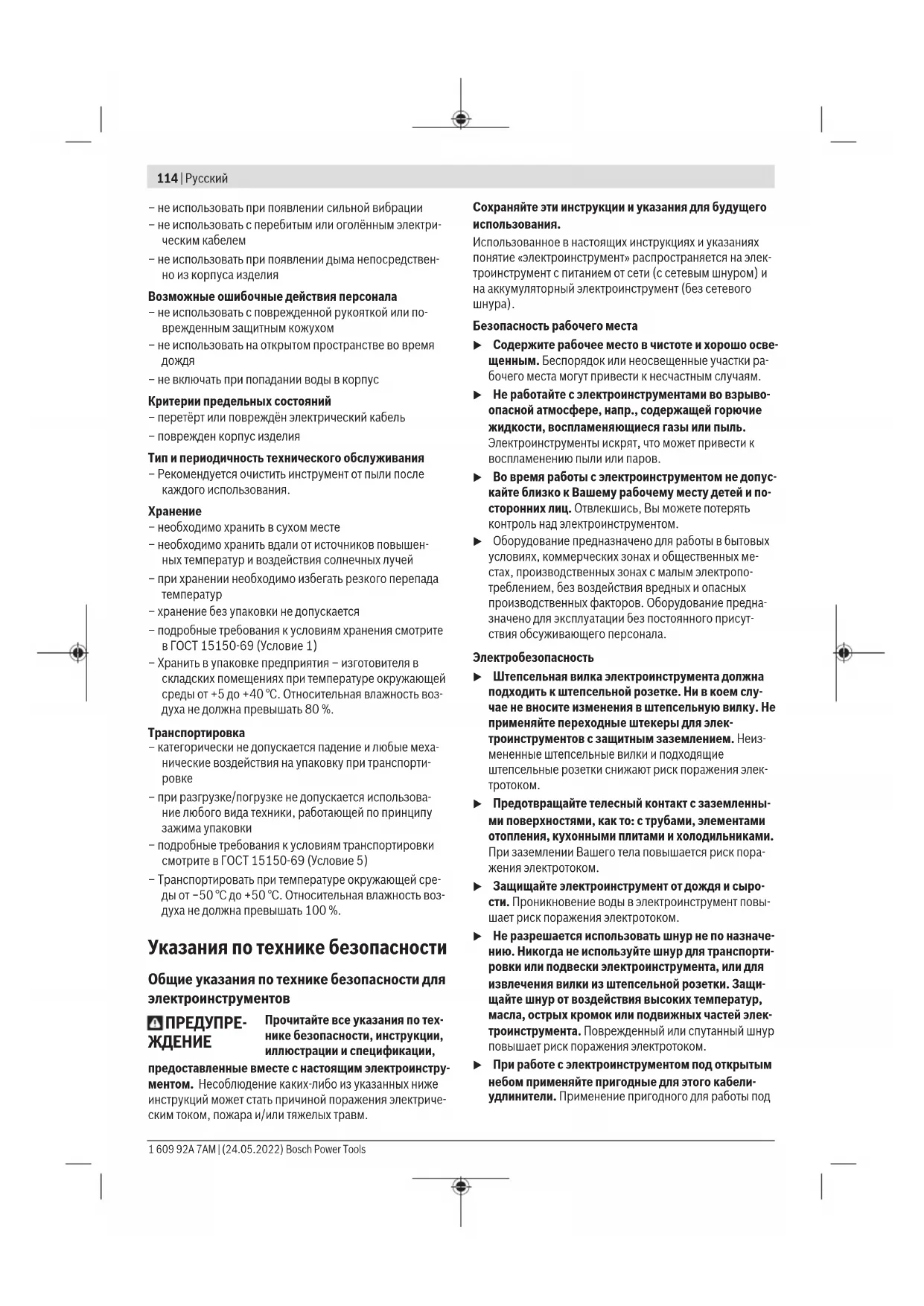 Toлько для стран Евразийского экономического союза (Таможенного союза) В состав эксплуатационных документов, предусмотрен- ных изготовителем для продукции, могут входить настоя- щее руководство по эксплуатации, а также приложения. Информация о подтверждении соответствия содержится в приложении. Информация о стране происхождения указана на корпу- се изделия и в приложении. Дата изготовления указана на последней странице об- ложки Руководства. Контактная информация относительно импортера содер- жится на упаковке. Срок службы изделия Срок службы изделия составляет 7 лет. Не рекомендует- ся к эксплуатации по истечении 5 лет хранения с даты изготовления без предварительной проверки (дату изго- товления см. на этикетке). Указанный срок службы действителен при соблюдении потребителем требований настоящего руководства. Перечень критических отказов – не использовать при сильном искрении Bosch Power Tools 1 609 92A 7AM | (24.05.2022)114 | Русский – не использовать при появлении сильной вибрации – не использовать с перебитым или оголённым электри- ческим кабелем – не использовать при появлении дыма непосредствен- но из корпуса изделия Возможные ошибочные действия персонала – не использовать с поврежденной рукояткой или по- врежденным защитным кожухом – не использовать на открытом пространстве во время