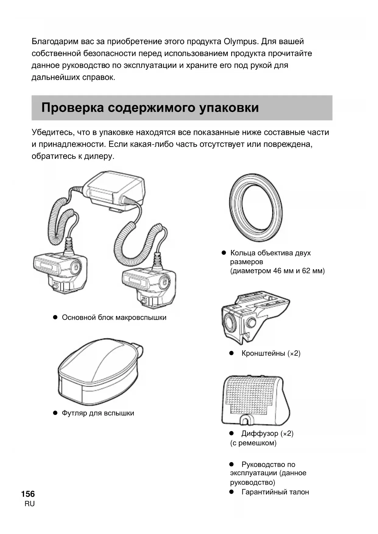 Благодарим вас за приобретение этого продукта Olympus. Для вашей собственной безопасности перед использованием продукта прочитайте данное руководство по эксплуатации и храните его под рукой для дальнейших справок. Проверка содержимого упаковки Убедитесь, что в упаковке находятся все показанные ниже составные части и принадлежности. Если какая-либо часть отсутствует или повреждена, обратитесь к дилеру. Руководство по эксплуатации (данное руководство) Гарантийный талон Основной блок макровспышки Футляр для вспышки Кольца объектива двух