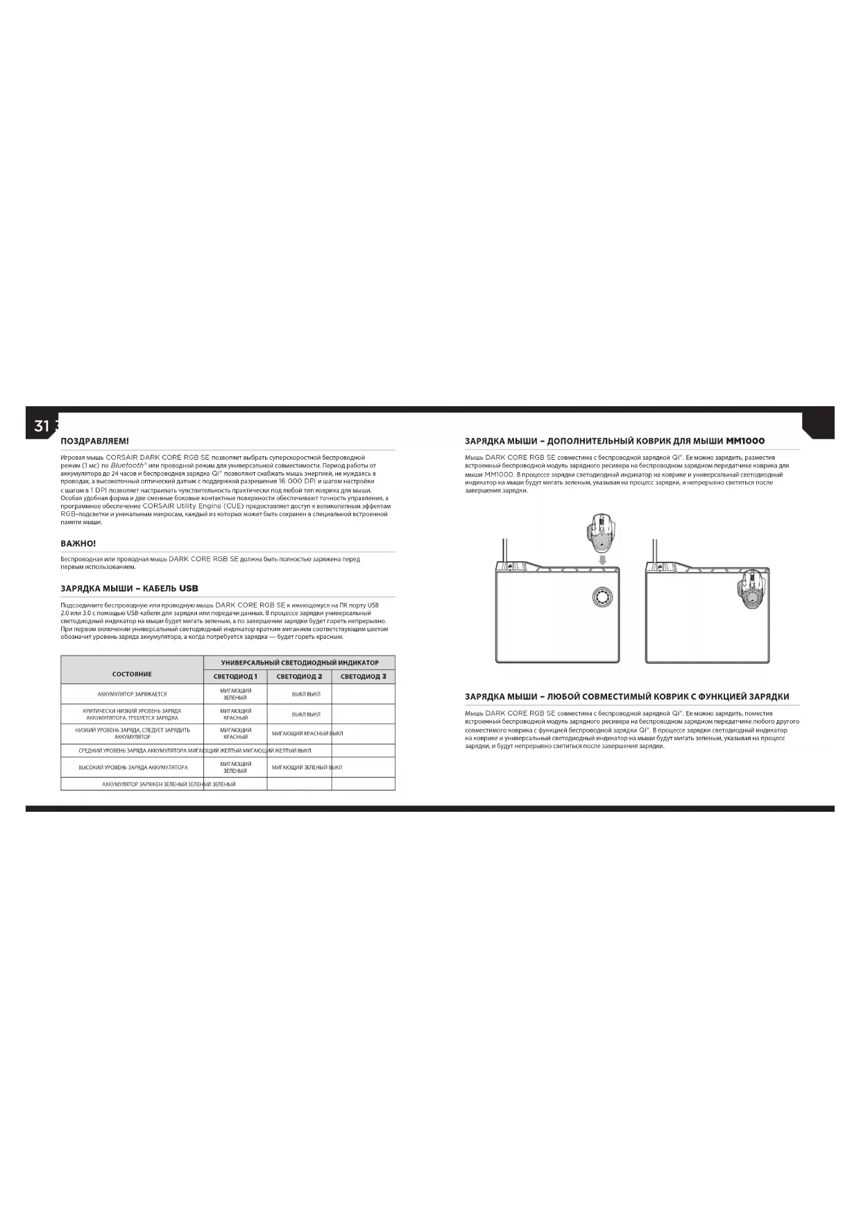 Мышь DARK CORE RGB SE совместима с беспроводной зарядкой Qi®. Ее можно зарядить, поместив встроенный беспроводной модуль зарядного ресивера на беспроводном зарядном передатчике любого другого совместимого коврика с функцией беспроводной зарядки Qi®. В процессе зарядки светодиодный индикатор на коврике и универсальный светодиодный индикатор на мыши будут мигать зеленым, указывая на процесс зарядки, и будут непрерывно светиться после завершения зарядки. ЗАРЯДКА МЫШИ – ЛЮБОЙ СОВМЕСТИМЫЙ КОВРИК С ФУНКЦИЕЙ ЗАРЯДКИ Мышь DARK CORE RGB SE совместима с беспроводной зарядкой Qi®. Ее можно зарядить, разместив встроенный беспроводной модуль зарядного ресивера на беспроводном зарядном передатчике коврика для мыши MM1000. В процессе зарядки светодиодный индикатор на коврике и универсальный светодиодный индикатор на мыши будут мигать зеленым, указывая на процесс зарядки, и непрерывно светиться после завершения зарядки. ЗАРЯДКА МЫШИ – ДОПОЛНИТЕЛЬНЫЙ КОВРИК ДЛЯ МЫШИ MM1000 Подсоедините беспроводную или проводную мышь DARK CORE RGB SE к имеющемуся на ПК порту USB