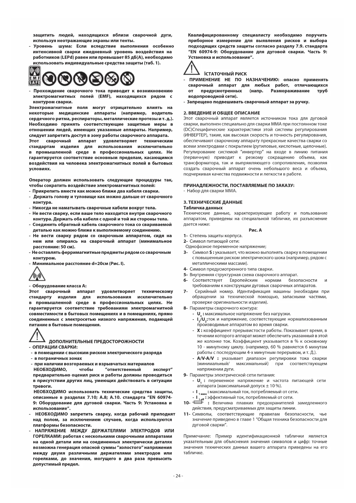 значение приведено в главе 1 “Общая техника безопасности для дуговой сварки”. Примечание: Пример идентификационной таблички является указательным для объяснения значения символов и цифр: точные значения технических данных вашего аппарата приведены на его табличке.- 25 - ПРОЧИЕ ТЕХНИЧЕСКИЕ ДАННЫЕ: - СВАРОЧНЫЙ АППАРАТ: - смотри таблицу 1 (ТАБ.1) - %USE AT 20°C (если имеется на оболочке сварочного аппарата). USE AT 20°C, выражает для каждого диаметра (Ø ELECTRODE) количество сварных электродов в диапазоне 10 минут (ELECTRODES 10 MIN) при 20°C с паузой в 20 секунд для каждой замены электрода; этот параметр указан также в процентном выражении (%USE), относительно максимального числа свариваемых электродов. - ЗАЖИМ С ЭЛЕКТРОДОМ: смотри таблицу 2 (ТАБ.2) Вес сварочного аппарата указан в таблице 1 (TAБ.1)
