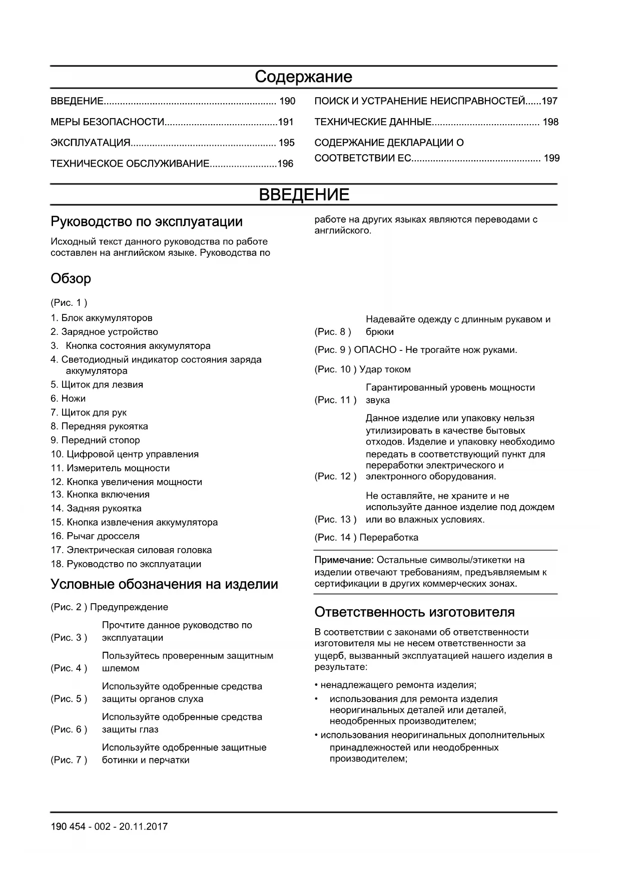 - использования неоригинальных дополнительных принадлежностей или неодобренных производителем; 190 454 - 002 - 20.11.2017• ремонта изделия в неавторизованном сервисном центре или неквалифицированным специалистом. МЕРЫ БЕЗОПАСНОСТИ Инструкции по технике безопасности Ниже приведены определения уровня опасности для каждого сигнального слова. ПРЕДУПРЕЖДЕНИЕ: Травмирование