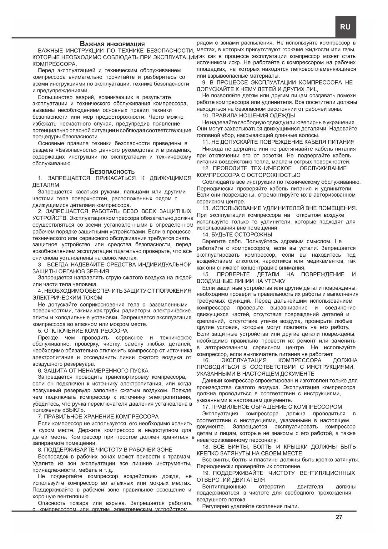 Берегите себя. Пользуйтесь здравым смыслом. Не работайте с компрессором, если вы устали. Запрещается эксплуатировать компрессор, если вы находитесь под воздействием алкоголя, наркотиков или медикаментов, так как они снижают концентрацию внимания.
