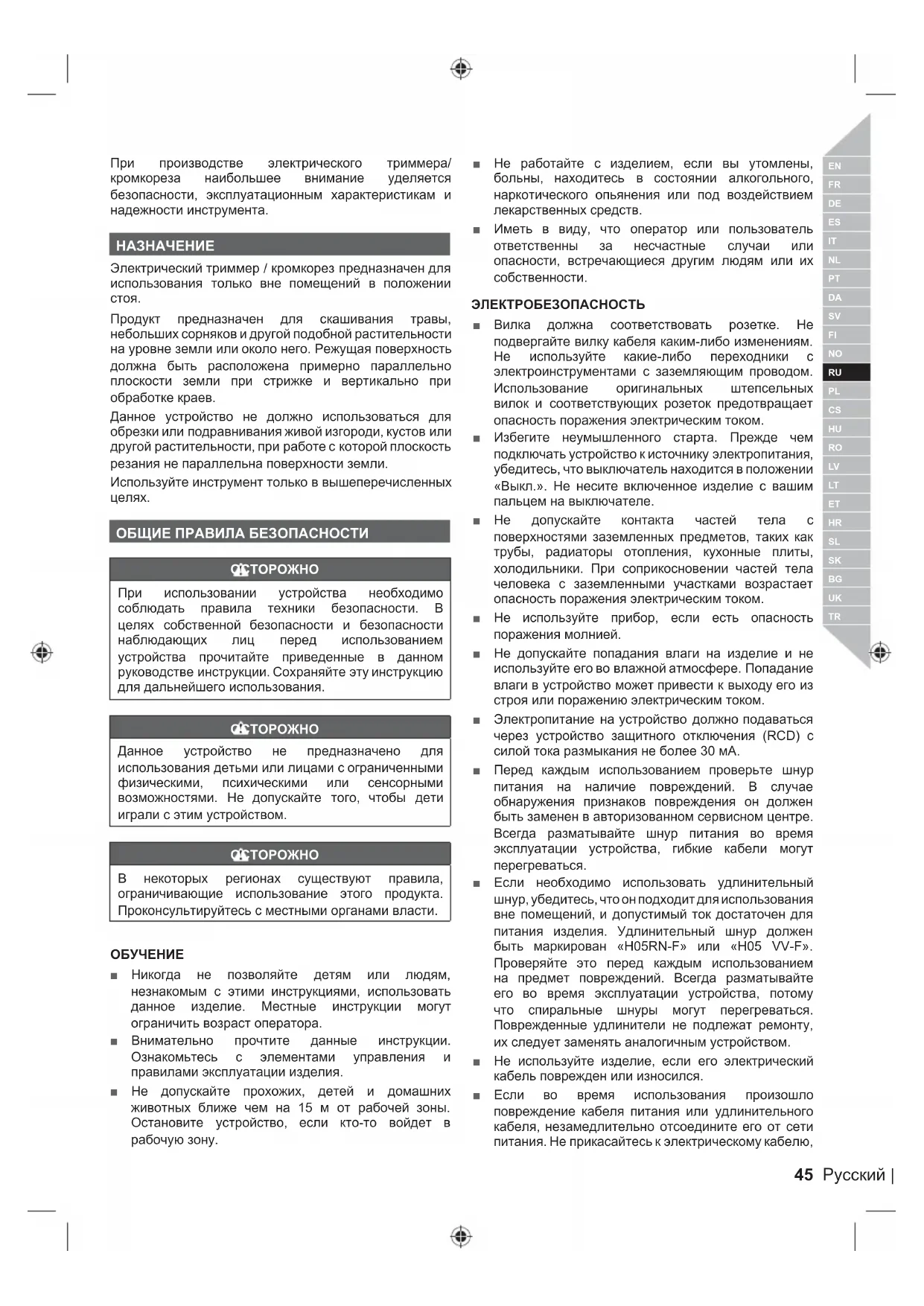 ■ Никогда не позволяйте детям или людям, незнакомым с этими инструкциями, использовать данное изделие. Местные инструкции могут ограничить возраст оператора. ■ Внимательно прочтите данные инструкции. Ознакомьтесь с элементами управления и правилами эксплуатации изделия. ■ Не допускайте прохожих, детей и домашних животных ближе чем на 15 м от рабочей зоны. Остановите устройство, если кто-то войдет в рабочую зону. ■ Не работайте с изделием, если вы утомлены, больны, находитесь в состоянии алкогольного, наркотического опьянения или под воздействием лекарственных средств. ■ Иметь в виду, что оператор или пользователь ответственны за несчастные случаи или опасности, встречающиеся другим людям или их собственности. ЭЛЕКТРОБЕЗОПАСНОСТЬ ■ Вилка должна соответствовать розетке. Не подвергайте вилку кабеля каким-либо изменениям. Не используйте какие-либо переходники с электроинструментами с заземляющим проводом. Использование оригинальных штепсельных вилок и соответствующих розеток предотвращает опасность поражения электрическим током. ■ Избегите неумышленного старта. Прежде чем подключать устройство к источнику электропитания, убедитесь, что выключатель находится в положении «Выкл.». Не несите включенное изделие с вашим пальцем на выключателе. ■ Не допускайте контакта частей тела с поверхностями заземленных предметов, таких как трубы, радиаторы отопления, кухонные плиты, холодильники. При соприкосновении частей тела человека с заземленными участками возрастает опасность поражения электрическим током. ■ Не используйте прибор, если есть опасность поражения молнией. ■ Не допускайте попадания влаги на изделие и не используйте его во влажной атмосфере. Попадание влаги в устройство может привести к выходу его из строя или поражению электрическим током. ■ Электропитание на устройство должно подаваться через устройство защитного отключения (RCD) с силой тока размыкания не более 30 мА. ■ Перед каждым использованием проверьте шнур питания на наличие повреждений. В случае обнаружения признаков повреждения он должен быть заменен в авторизованном сервисном центре. Всегда разматывайте шнур питания во время эксплуатации устройства, гибкие кабели могут перегреваться. ■ Если необходимо использовать удлинительный шнур, убедитесь, что он подходит для использования вне помещений, и допустимый ток достаточен для питания изделия. Удлинительный шнур должен быть маркирован «H05RN-F» или «H05 VV-F». Проверяйте это перед каждым использованием на предмет повреждений. Всегда разматывайте его во время эксплуатации устройства, потому что спиральные шнуры могут перегреваться. Поврежденные удлинители не подлежат ремонту, их следует заменять аналогичным устройством. ■ Не используйте изделие, если его электрический кабель поврежден или износился. ■ Если во время использования произошло повреждение кабеля питания или удлинительного кабеля, незамедлительно отсоедините его от сети питания. Не прикасайтесь к электрическому кабелю,46 | Русский пока он не будет отключен от источника питания. ■ Убедитесь, что шнур питания расположен так, что невозможно его порезать, наступить на него, споткнуться об него или повредить каким-либо иным способом. ■ Запрещается тянуть за кабель питания для поднятия или перемещения изделия. ■ Не раскладывайте ка