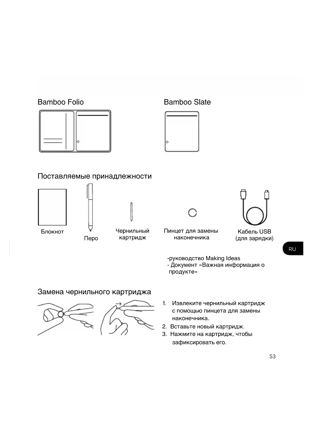 Bamboo Folio Поставляемые принадлежности Замена чернильного картриджа -руководство Making Ideas - Документ «Важная информация о