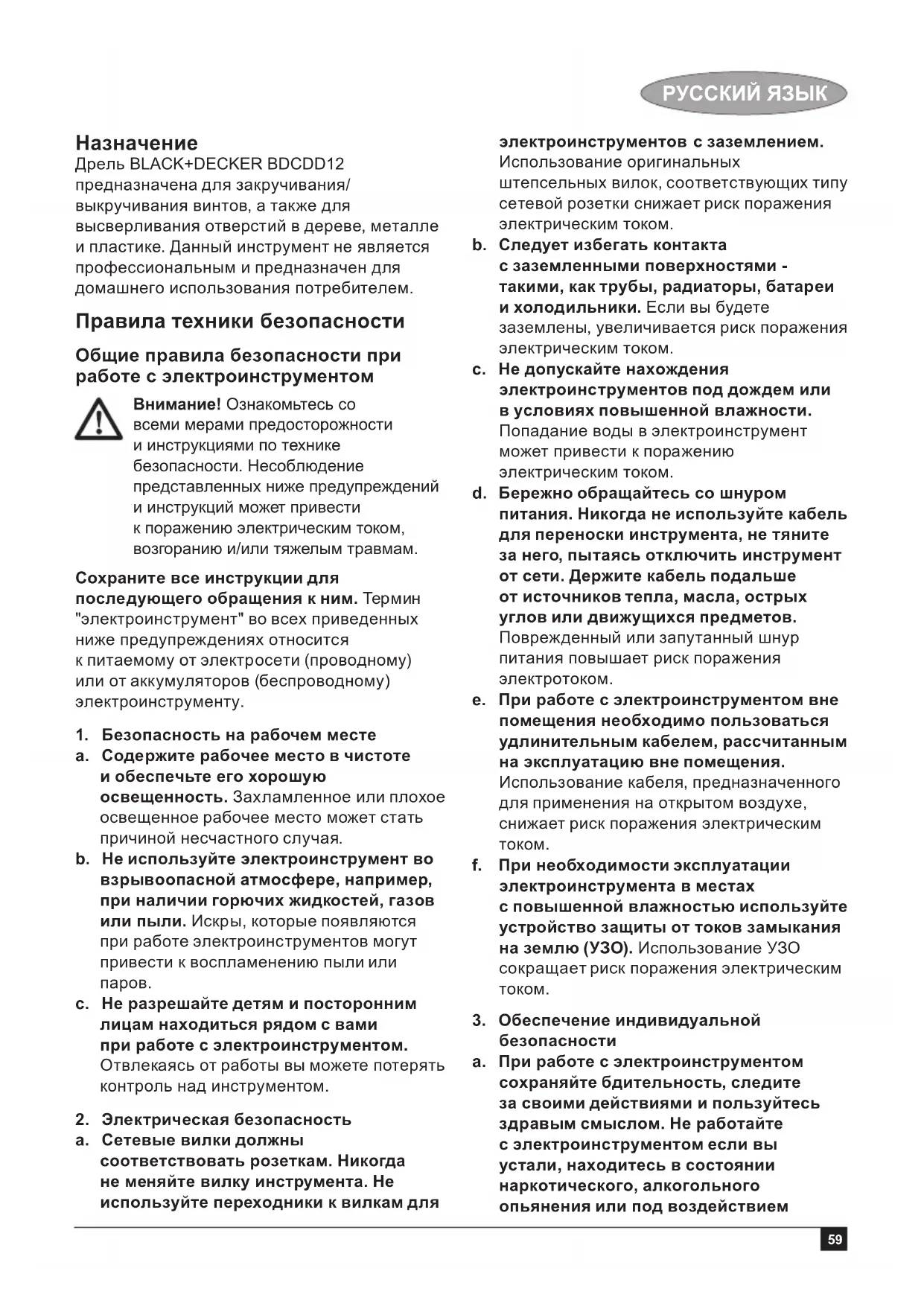 Дрель BLACK+DECKER BDCDD12 предназначена для закручивания/ выкручивания винтов, а также для высверливания отверстий в дереве, металле и пластике. Данный инструмент не является профессиональным и предназначен для домашнего использования потребителем. Правила техники безопасности Общие правила безопасности при работе с электроинструментом Внимание! Ознакомьтесь со всеми мерами предосторожности и инструкциями по технике безопасности. Несоблюдение представленных ниже предупреждений и инструкций может привести к поражению электрическим током, возгоранию и/или тяжелым травмам. Сохраните все инструкции для последующего обращения к ним. Термин "электроинструмент" во всех приведенных ниже предупреждениях относится к питаемому от электросети (проводному) или от аккумуляторов (беспроводному) электроинструменту.