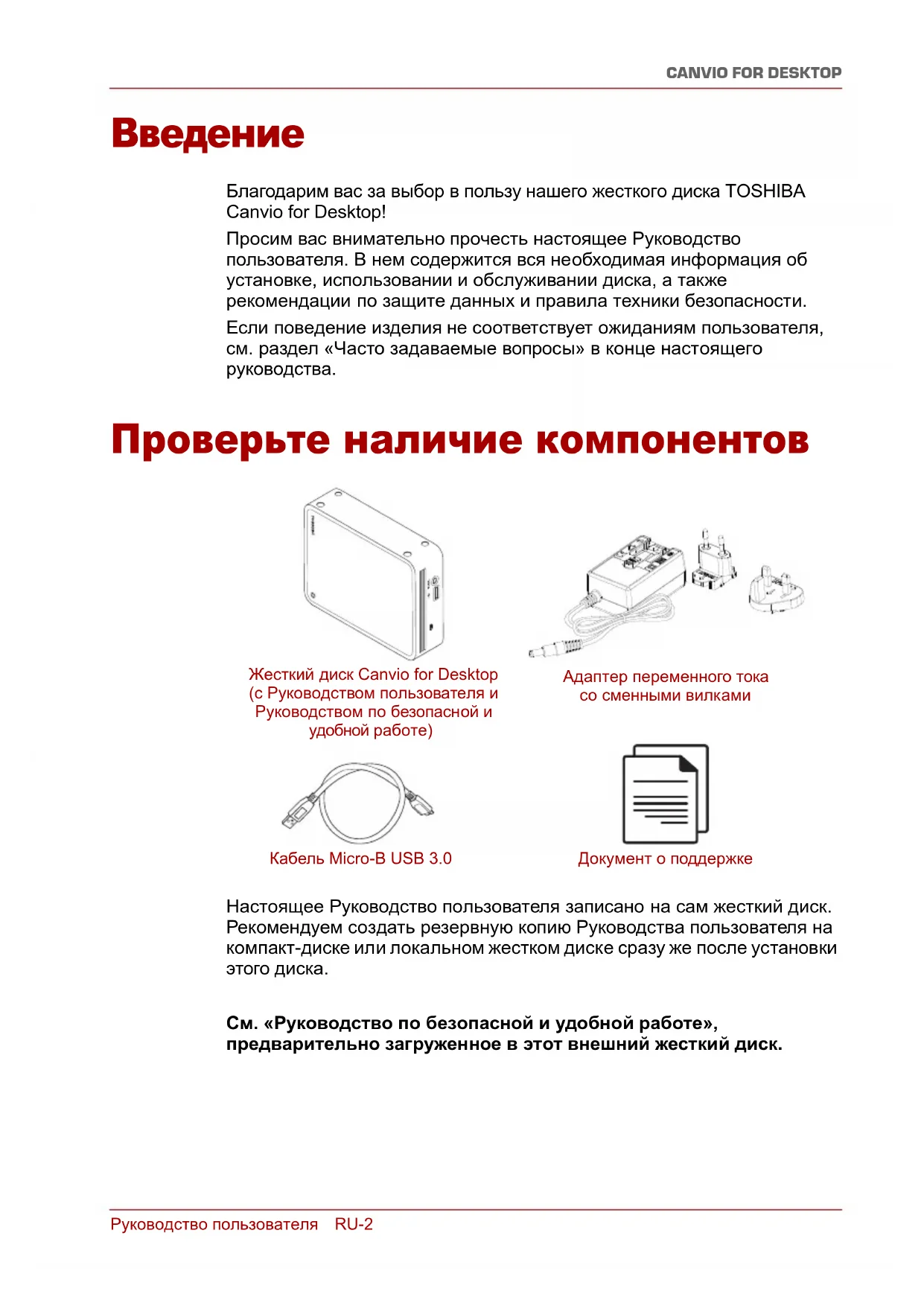 руководства. Проверьте наличие компонентов Настоящее Руководство пользователя записано на сам жесткий диск. Рекомендуем создать резервную копию Руководства пользователя на компакт-диске или локальном жестком диске сразу же после установки этого диска. См. «Руководство по безопасной и удобной работе», предварительно загруженное в этот внешний жесткий диск. Жесткий диск Canvio for Desktop (с Руководством пользователя и Руководством по безопасной и удобной работе) Адаптер переменного тока со сменными вилками Кабель Micro-B USB 3.0 Документ о поддержкеРуководство пользователя RU-3