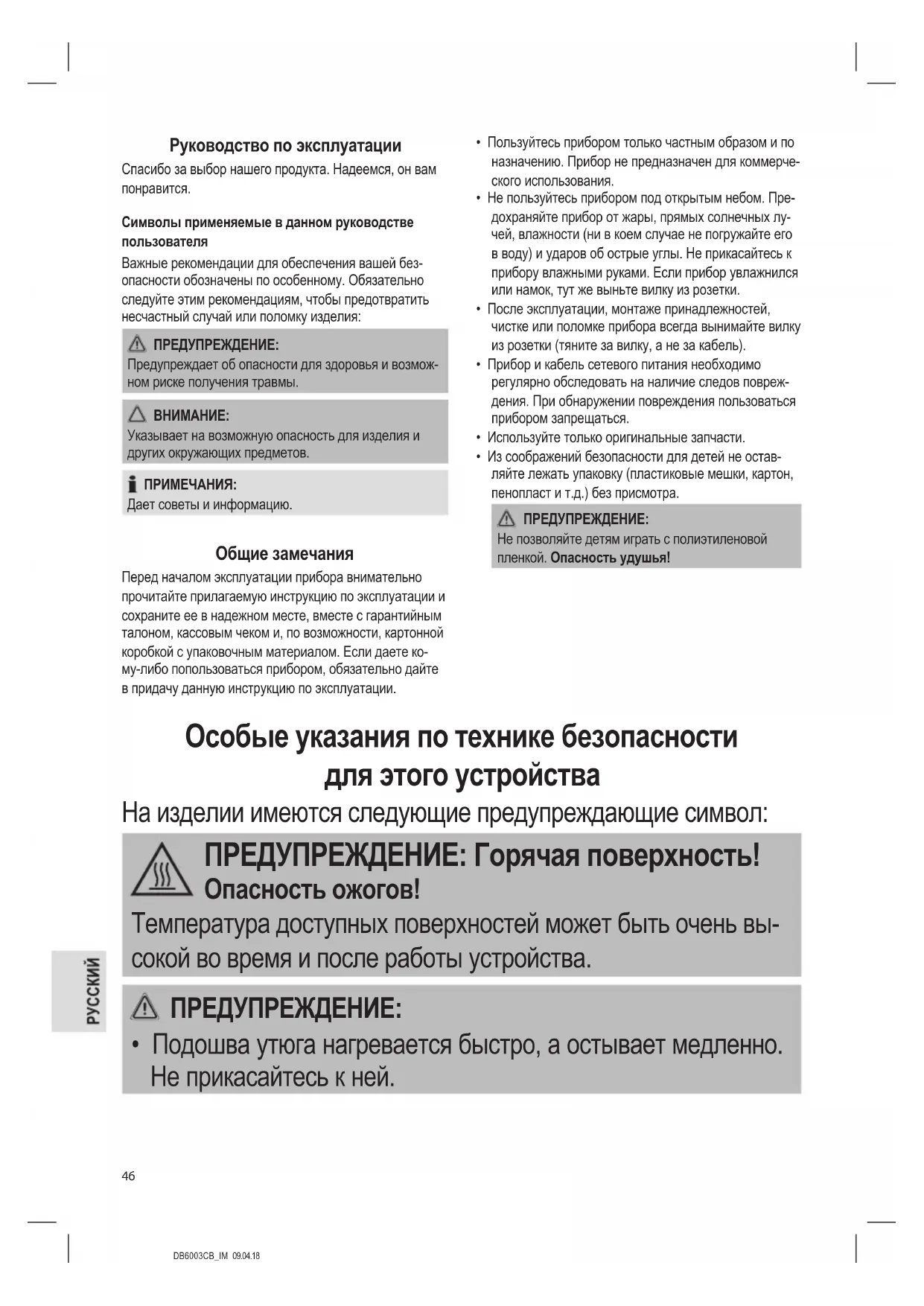 - Подошва утюга нагревается быстро, а остывает медленно. Не прикасайтесь к ней.DB6003CB_IM 09.04.18