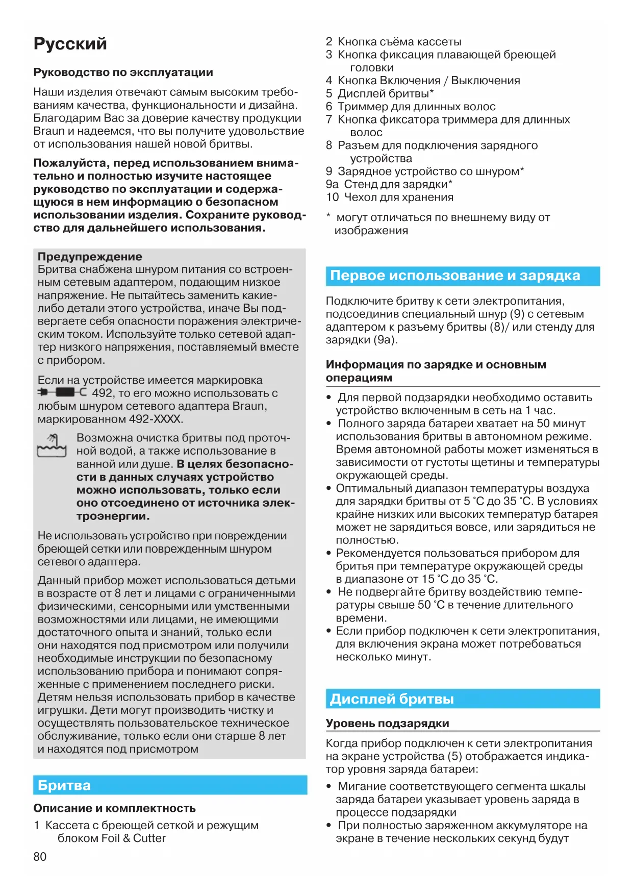 Руководство по эксплуатации Наши изделия отвечают самым высоким требо- ваниям качества, функциональности и дизайна. Благодарим Вас за доверие качеству продукции Braun и надеемся, что вы получите удовольствие от использования нашей новой бритвы. Пожалуйста, перед использованием внима- тельно и полностью изучите настоящее руководство по эксплуатации и содержа- щуюся в нем информацию о безопасном использовании изделия. Сохраните руковод- ство для дальнейшего использования. Предупреждение Бритва снабжена шнуром питания со встроен- ным сетевым адаптером, подающим низкое напряжение. Не пытайтесь заменить какие- либо детали этого устройства, иначе Вы под- вергаете себя опасности поражения электриче- ским током. Используйте только сетевой адап- тер низкого напряжения, поставляемый вместе с прибором. Если на устройстве имеется маркировка 492, то его можно использовать с любым шнуром сетевого адаптера Braun, маркированном 492-ХХХХ. Возможна очистка бритвы под проточ- ной водой, а также использование в ванной или душе. В целях безопасно- сти в данных случаях устройство можно использовать, только если оно отсоединено от источника элек- троэнергии. Не использовать устройство при повреждении бреющей сетки или поврежденным шнуром сетевого адаптера. Данный прибор может использоваться детьми в возрасте от 8 лет и лицами с ограниченными физическими, сенсорными или умственными возможностями или лицами, не имеющими достаточного опыта и знаний, только если они находятся под присмотром или получили необходимые инструкции по безопасному использованию прибора и понимают сопря- женные с применением последнего риски. Детям нельзя использовать прибор в качестве игрушки. Дети могут производить чистку и осуществлять пользовательское техническое обслуживание, только если они старше 8 лет и находятся под присмотром