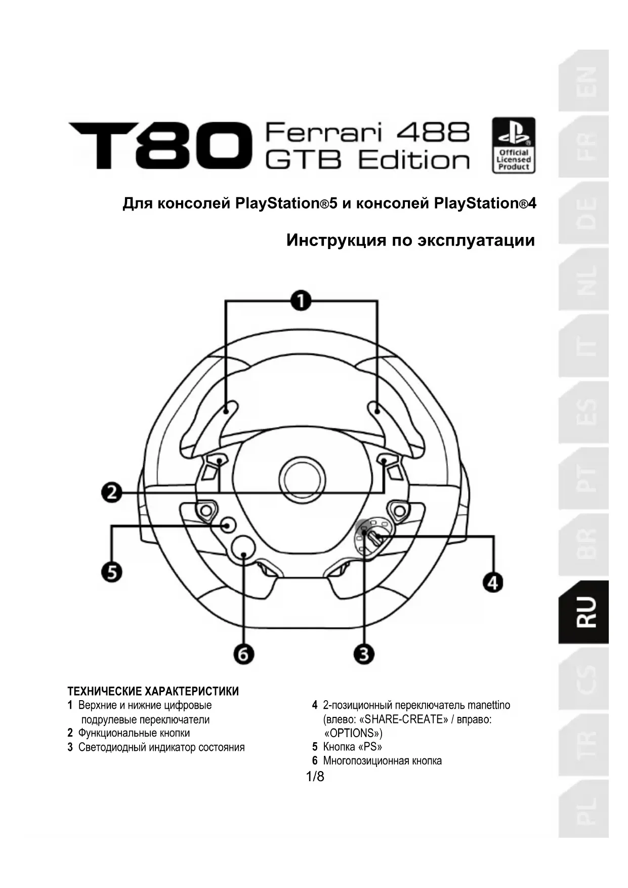 ТЕХНИЧЕСКИЕ ХАРАКТЕРИСТИКИ 1 Верхние и нижние цифровые подрулевые переключатели 2 Функциональные кнопки 3 Светодиодный индикатор состояния 4 2-позиционный переключатель manettino (влево: «SHARE-CREATE» / вправо: «OPTIONS») 5 Кнопка «PS» 6 Многопозиционная кнопка2/8