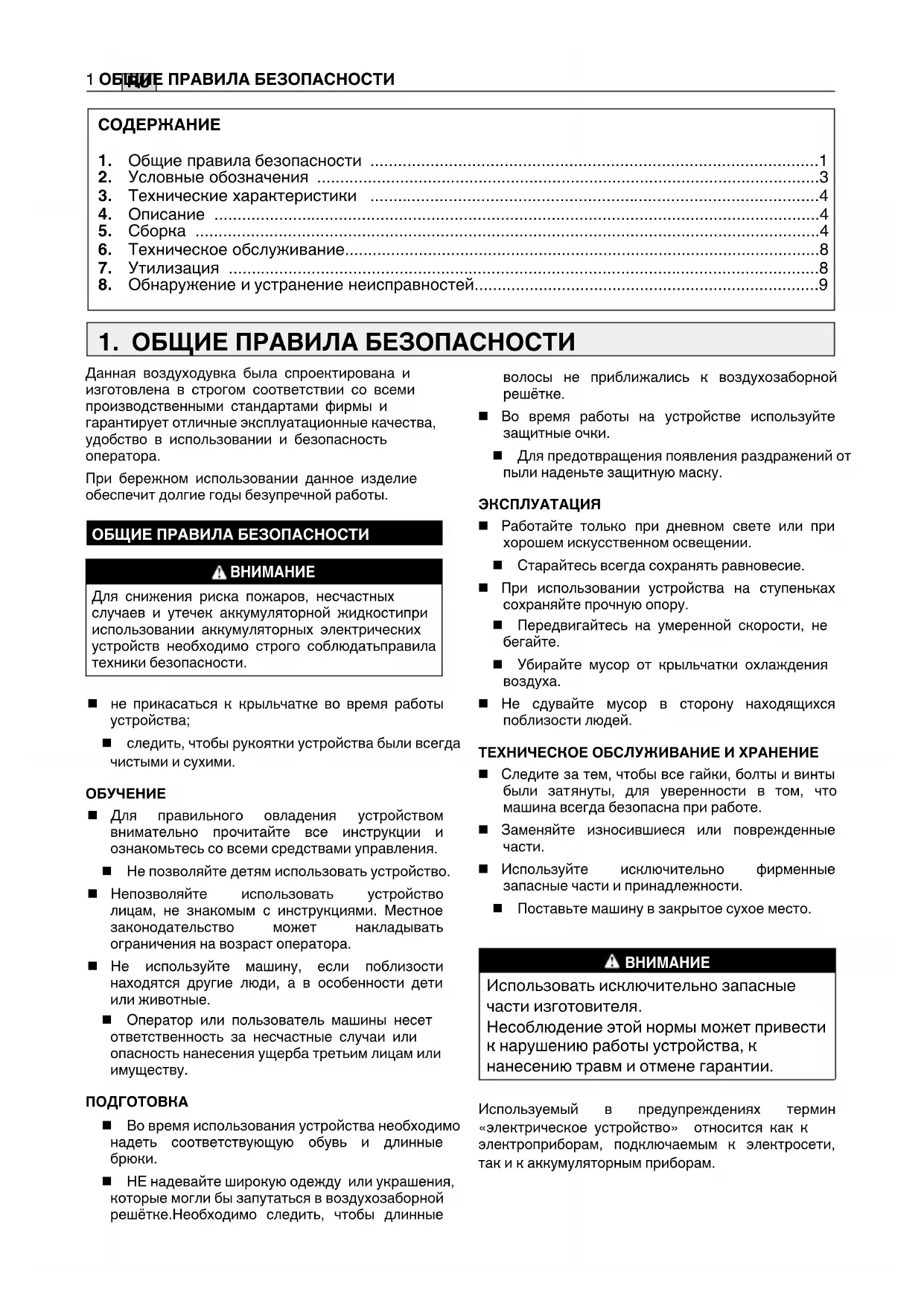 Для снижения риска пожаров, несчастных случаев и утечек аккумуляторной жидкостипри использовании аккумуляторных электрических устройств необходимо строго соблюдатьправила техники безопасности. не прикасаться к крыльчатке во время работы устройства; следить, чтобы рукоятки устройства были всегда чистыми и сухими.