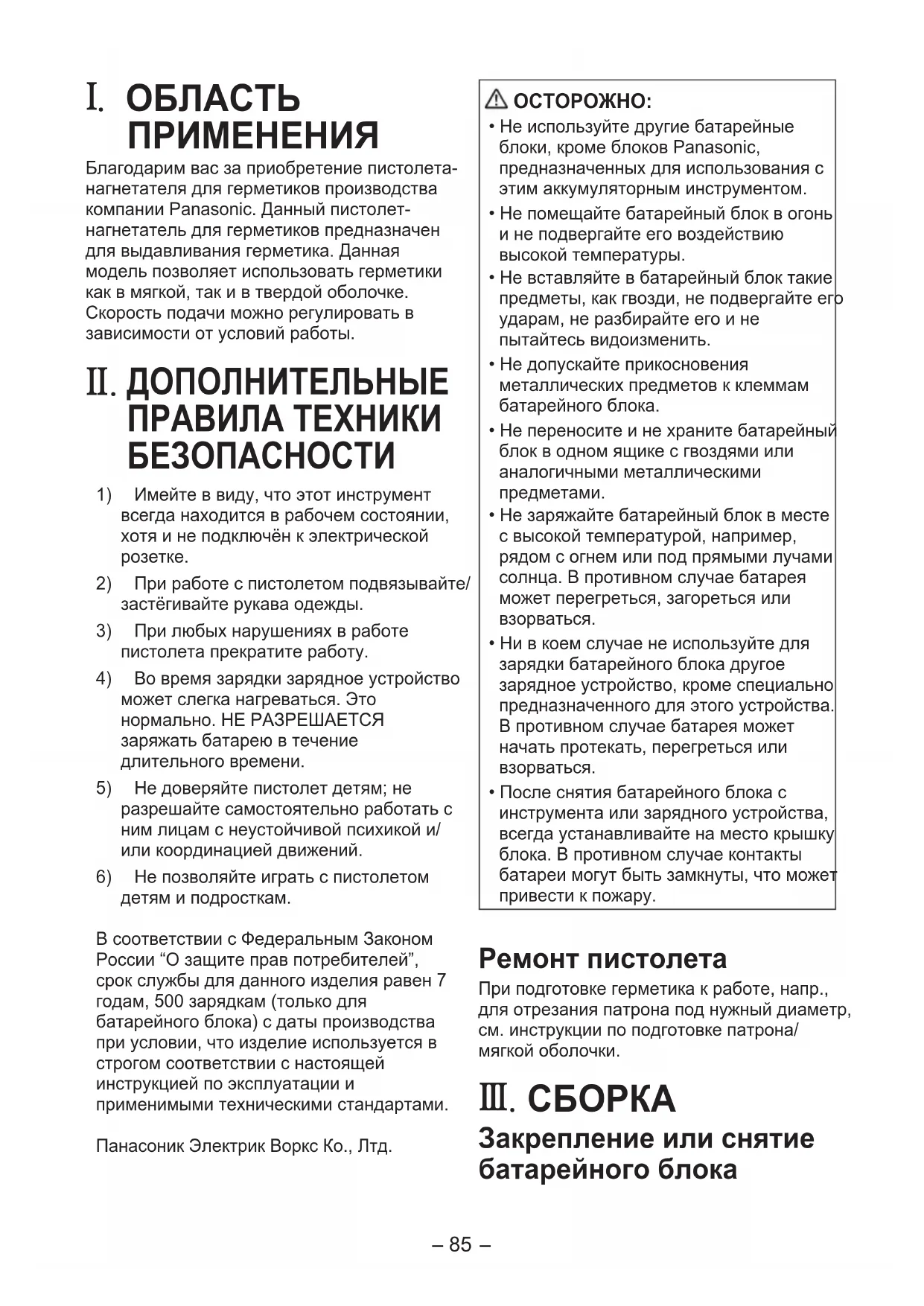детямиподросткам. ВсоответствиисФедеральнымЗаконом России“Озащитеправпотребителей”, срокслужбыдляданногоизделияравен7 годам,500зарядкам(толькодля батарейногоблока)сдатыпроизводства приусловии,чтоизделиеиспользуетсяв строгомсоответствииснастоящей инструкциейпоэксплуатациии применимымитехническимистандартами. ПанасоникЭлектрикВорксКо.,Лтд.