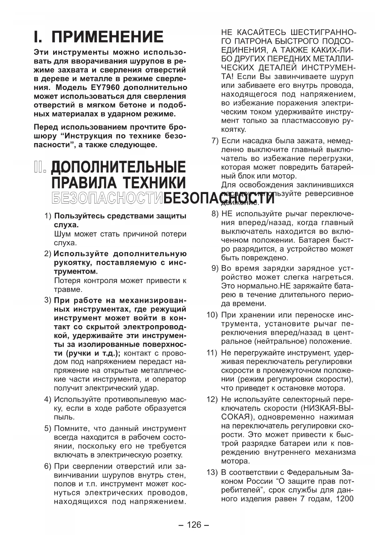 Эти инструменты можно использо- вать для вворачивания шурупов в ре- жиме захвата и сверления отверстий в дереве и металле в режиме сверле- ния. Модель EY7960 дополнительно может использоваться для сверления отверстий в мягком бетоне и подоб- ных материалах в ударном режиме. Перед использованием прочтите бро- шюру “Инструкция по технике безо- пасности”, а также следующее.