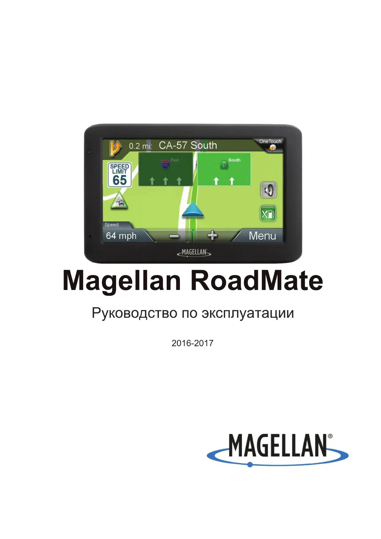 - все помехи, включая те, которые могут препятствовать его нормальной эксплуатации.ВАЖНОЕ ПРИМЕЧАНИЕ Соответствие требованиям IC к воздействию излучения Данный прибор соответствует установленным IC ограничениям на воздействие излучения для неконтролируемых условий. Конечные пользователи должны соблюдать особые инструкции по эксплуатации для обеспечения соответствия требованиям к высокочастотному излучению. Данный передатчик не должен располагаться или работать в сочетании с другими антеннами или передатчиками. Одна или несколько формул изобретения следующих патентов может распространяться на данный прибор: патент США № 5,544,060, патент США № 5,654,892, патент США № 5,832,408, патент США № 5,987,375 Информация, представленная в настоящем документе, может быть изменена без уведомления. Улучшения и усовершенствования данного прибора могут быть выполнены без какого-либо официального уведомления. Дополнительные сведения и обновления изделия см. на веб-сайте компании Magellan (www.magellanGPS.com/support). Canada, avis d’Industry Canada (IC) Le présent appareil est conforme aux CNR d’Industrie Canada applicables aux appareils radio exempts de licence. L’exploitation est autorisée aux deux conditions suivantes : (1) l’appareil ne doit pas produire de brouillage, et (2) l’utilisateur de l’appareil doit accepter tout brouillage radioélectrique subi, même si le brouillage est susceptible d’en compromettre le fonctionnement. © MiTAC International Corporation, 2016–2017 гг. Логотип Magellan, Magellan, RoadMate и Quickspell являются зарегистрированными товарными знаками компании MiTAC International Corporation. SmartDetour и OneTouch являются товарными знаками компании MiTAC International Corporation и используются по лицензии компанией MiTAC International Corporation. Все права защищены. Все прочие фирменные названия и названия изделий являются товарными знаками соответствующих правообладателей. Без получения предварительного письменного разрешения компании MiTAC International Corporation никакие части данного Руководства пользователя нельзя воспроизводить или распространять в какой бы то ни было форме или какими-либо средствами, как электронными, так и механическими, включая фотокопирование и запись, в любых целях, не относящихся к личному пользованию покупателя. Сведения, представленные в настоящем документе, являются верными на момент его создания. Компания MiTAC International Corporation не принимает на себя ответственности или обязательств в отношении каких-либо ошибок или неточностей, которые могут быть замечены в тексте настоящего Руководства пользователя. 112-0120-001 В настоящем Руководстве пользователя представлены все необходимые сведения об использовании различных функций приемника Magellan RoadMate. Посетите веб-сайт нашей компании magellanGPS.com/supportСодержание GPS-приемник Magellan RoadMate p. 1