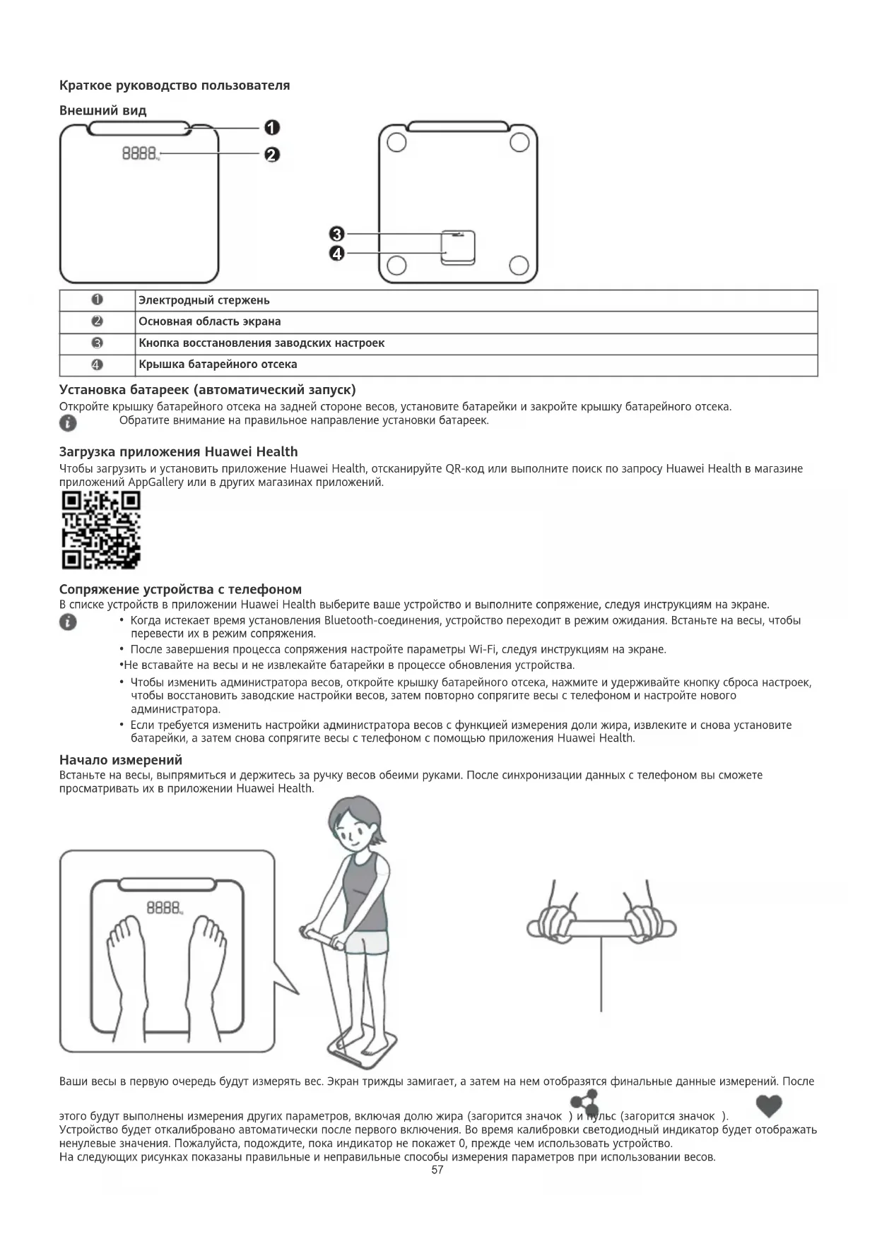 Крышка батарейного отсека Установка батареек (автоматический запуск) Откройте крышку батарейного отсека на задней стороне весов, установите батарейки и закройте крышку батарейного отсека. Обратите внимание на правильное направление установки батареек. Загрузка приложения Huawei Health Чтобы загрузить и установить приложение Huawei Health, отсканируйте QR-код или выполните поиск по запросу Huawei Health в магазине приложений AppGallery или в других магазинах приложений. Сопряжение устройства с телефоном В списке устройств в приложении Huawei Health выберите ваше устройство и выполните сопряжение, следуя инструкциям на экране.