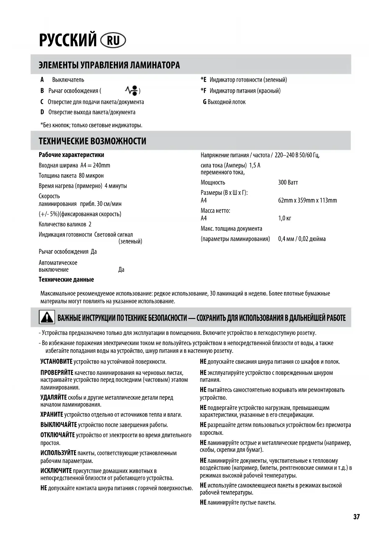 Рычаг освобождения Да Автоматическое выключение Да Технические данные Напряжение питания/частота/ 220–240В 50/60Гц, сила тока (Амперы) 1,5А переменного тока, Мощность 300Ватт Размеры (ВхШхГ): A4 62mm x 359mm x 113mm Масса нетто: A4 1,0кг Макс. толщина документа (параметры ламинирования) 0,4мм/0,02дюйма - Устройства предназначено только для эксплуатации в помещениях. Включите устройство в легкодоступную розетку. - Во избежание поражения электрическим током не пользуйтесь устройством в непосредственной близости от воды, а также избегайте попадания воды на устройство, шнур питания и в настенную розетку. УСТАНОВИТЕ устройство на устойчивой поверхности. ПРОВЕРЯЙТЕ качество ламинирования на черновых листах, настраивайте устройство перед последним (чистовым) этапом ламинирования. УДАЛЯЙТЕ скобы и другие металлические детали перед началом ламинирования. ХРАНИТЕ устройство отдельно от источников тепла и влаги. ВЫКЛЮЧАЙТЕ устройство после завершения работы. ОТКЛЮЧАЙТЕ устройство от электросети во время длительного
