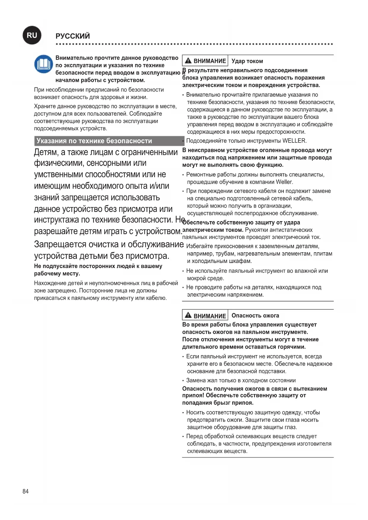 Перед началом любых работ выньте сетевую вилку устройства из розетки. Дайте прибору остыть. Регулярнопроверяйтевсеподключенныекабелии шланги.Поврежденныеэлектроинструментыдолжны бытьнезамедлительновыведеныизэксплуатации. Ремонтные работы должны выполнять специалисты, прошедшие обучение в компании Weller.
