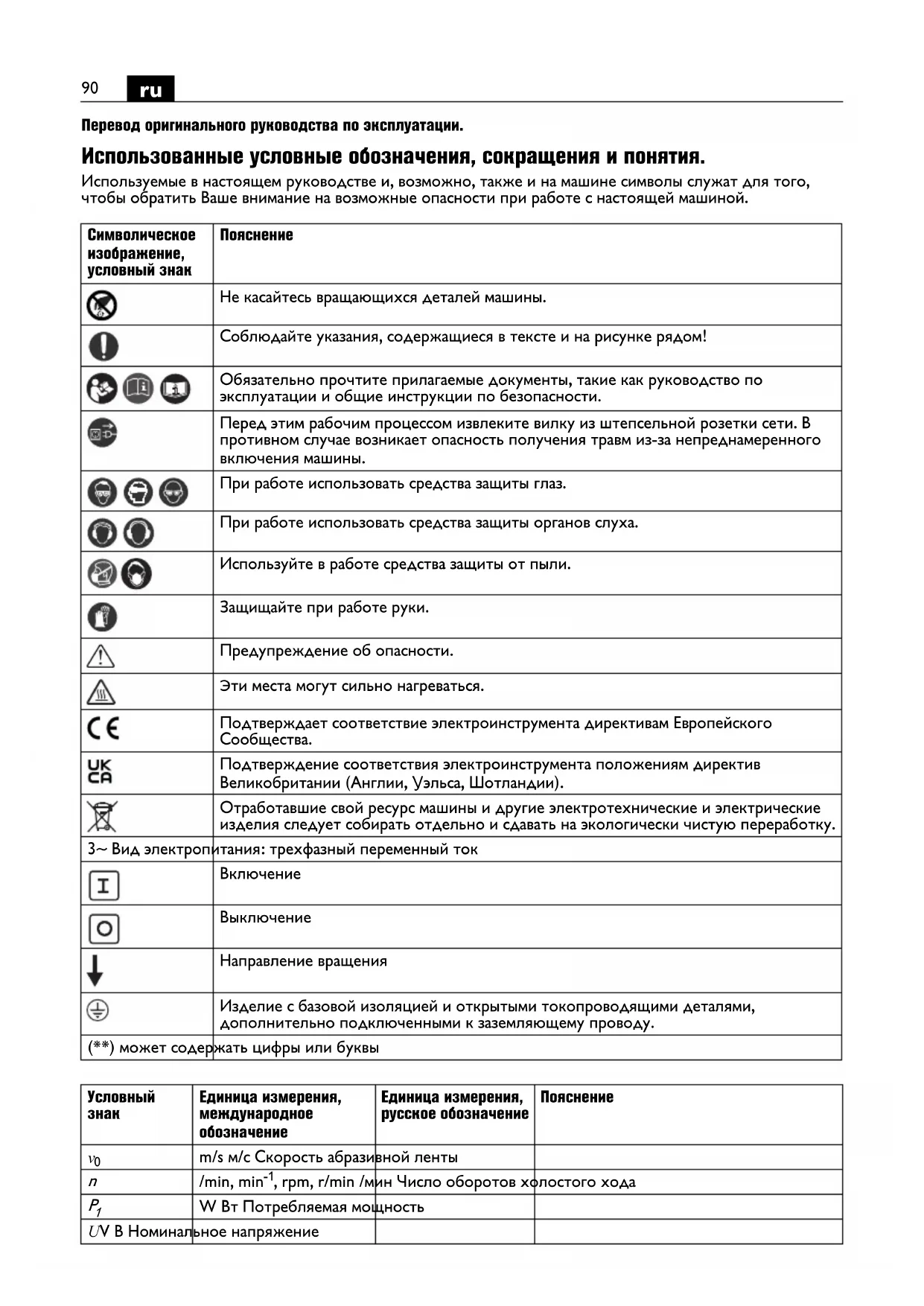 Не касайтесь вращающихся деталей машины. Соблюдайте указания, содержащиеся в тексте и на рисунке рядом! Обязательно прочтите прилагаемые документы, такие как руководство по эксплуатации и общие инструкции по безопасности. Перед этим рабочим процессом извлеките вилку из штепсельной розетки сети. В противном случае возникает опасность получения травм из-за непреднамеренного включения машины. При работе использовать средства защиты глаз. При работе использовать средства защиты органов слуха. Используйте в работе средства защиты от пыли. Защищайте при работе руки. Предупреждение об опасности. Эти места могут сильно нагреваться. Подтверждает соответствие электроинструмента директивам Европейского Сообщества. Подтверждение соответствия электроинструмента положениям директив Великобритании (Англии, Уэльса, Шотландии). Отработавшие свой ресурс машины и другие электротехнические и электрические изделия следует собирать отдельно и сдавать на экологически чистую переработку. 3~ Вид электропитания: трехфазный переменный ток