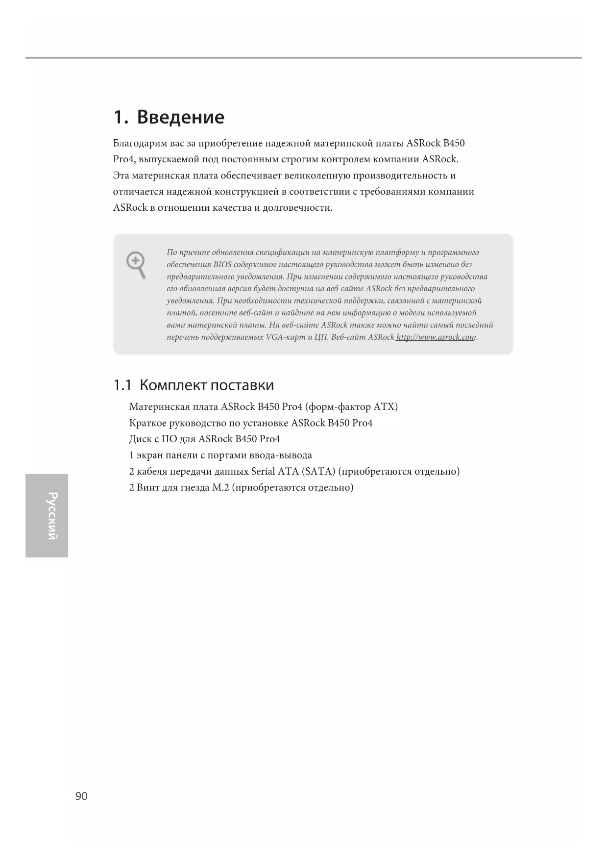 Благодарим вас за приобретение надежной материнской платы ASRock B450 Pro4, выпускаемой под постоянным строгим контролем компании ASRock. Эта материнская плата обеспечивает великолепную производительность и отличается надежной конструкцией в соответствии с требованиями компании ASRock в отношении качества и долговечности.