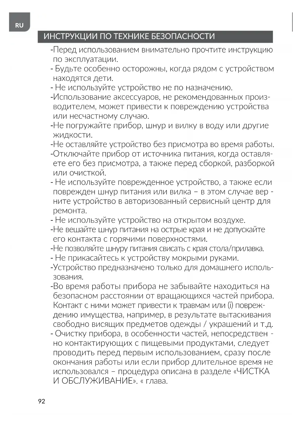 но контактирующих с пищевыми продуктами, следует проводить перед первым использованием, сразу после окончания работы или если прибор длительное время не использовался – процедура описана в разделе «ЧИСТКА И ОБСЛУЖИВАНИЕ». « глава.93