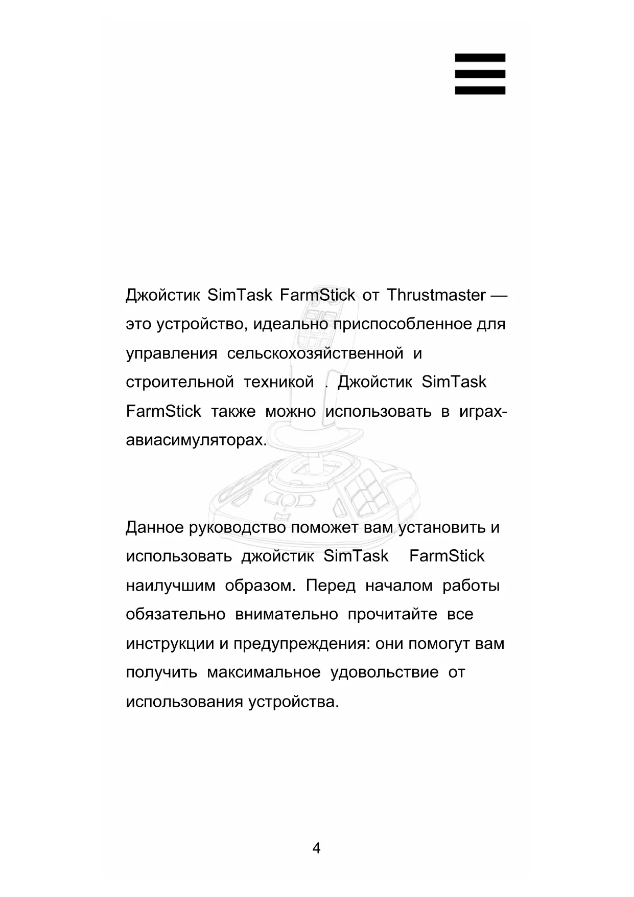 Данное руководство поможет вам установить и использовать джойстик SimTask FarmStick наилучшим образом. Перед началом работы обязательно внимательно прочитайте все инструкции и предупреждения: они помогут вам получить максимальное удовольствие от использования устройства.5