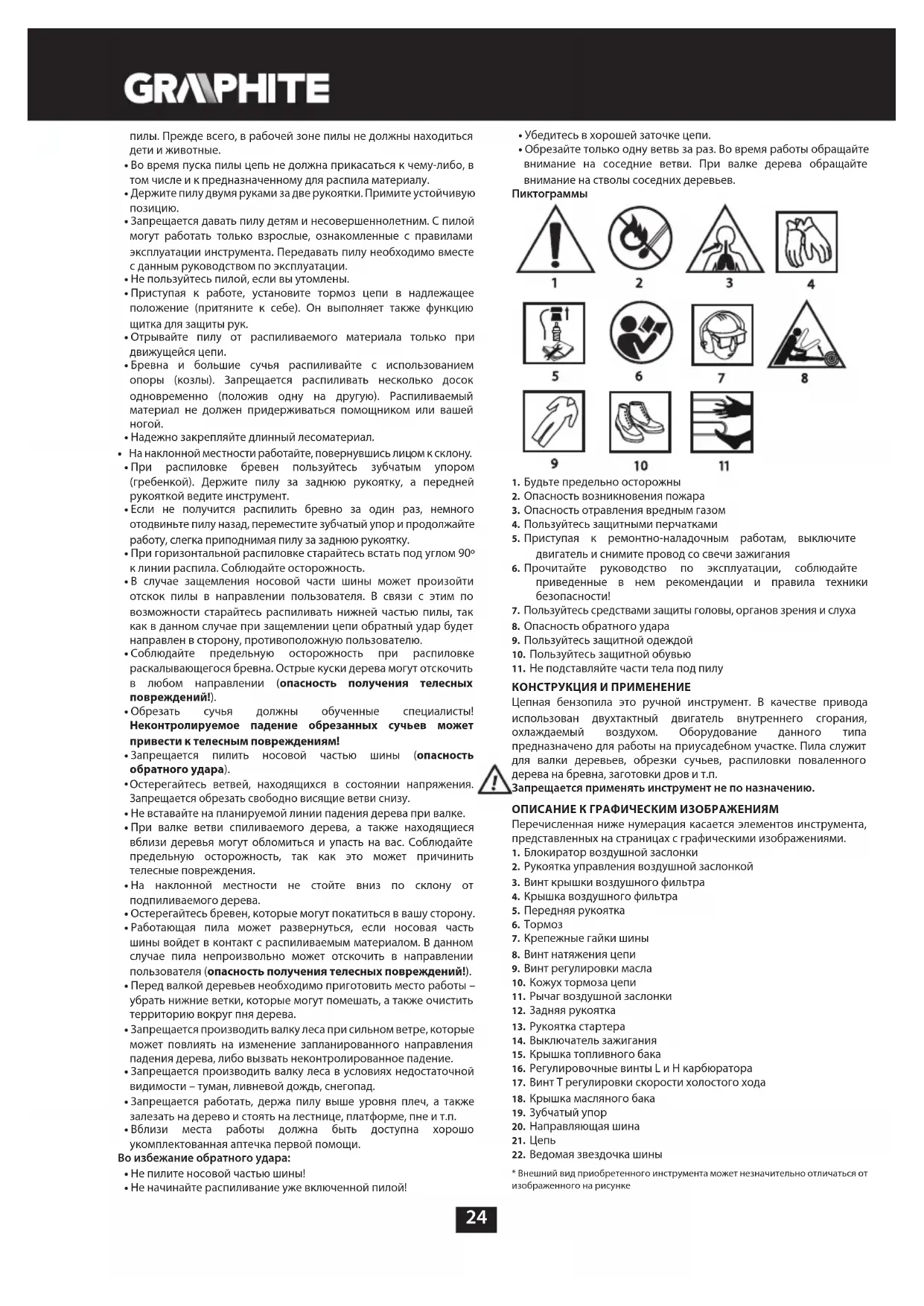 КОНСТРУКЦИЯ И ПРИМЕНЕНИЕ Цепная бензопила это ручной инструмент. В качестве привода использован двухтактный двигатель внутреннего сгорания, охлаждаемый воздухом. Оборудование данного типа предназначено для работы на приусадебном участке. Пила служит для валки деревьев, обрезки сучьев, распиловки поваленного дерева на бревна, заготовки дров и т.п. Запрещается применять инструмент не по назначению. ОПИСАНИЕ К ГРАФИЧЕСКИМ ИЗОБРАЖЕНИЯМ Перечисленная ниже нумерация касается элементов инструмента, представленных на страницах с графическими изображениями.