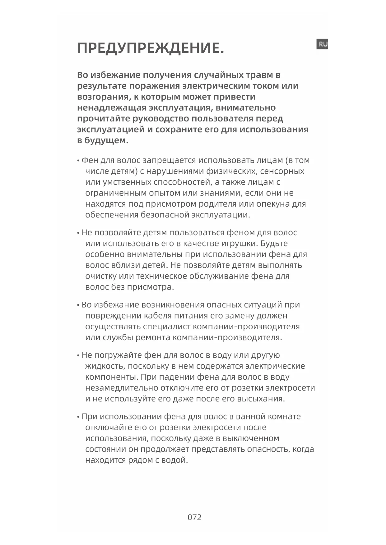 - При использовании фена для волос в ванной комнате отключайте его от розетки электросети после использования, поскольку даже в выключенном состоянии он продолжает представлять опасность, когда находится рядом с водой. 072• Не используйте фен для волос рядом с ванной, душем, раковиной или другими источниками воды.