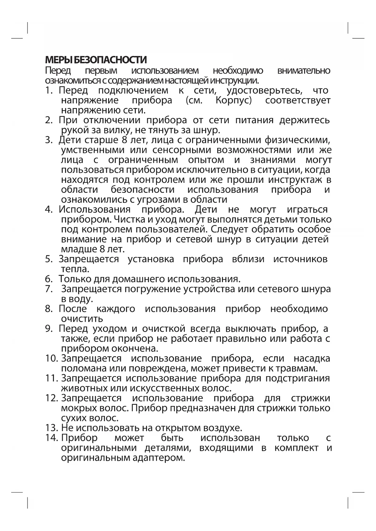 мокрых волос. Прибор предназначен для стрижки только сухих волос.