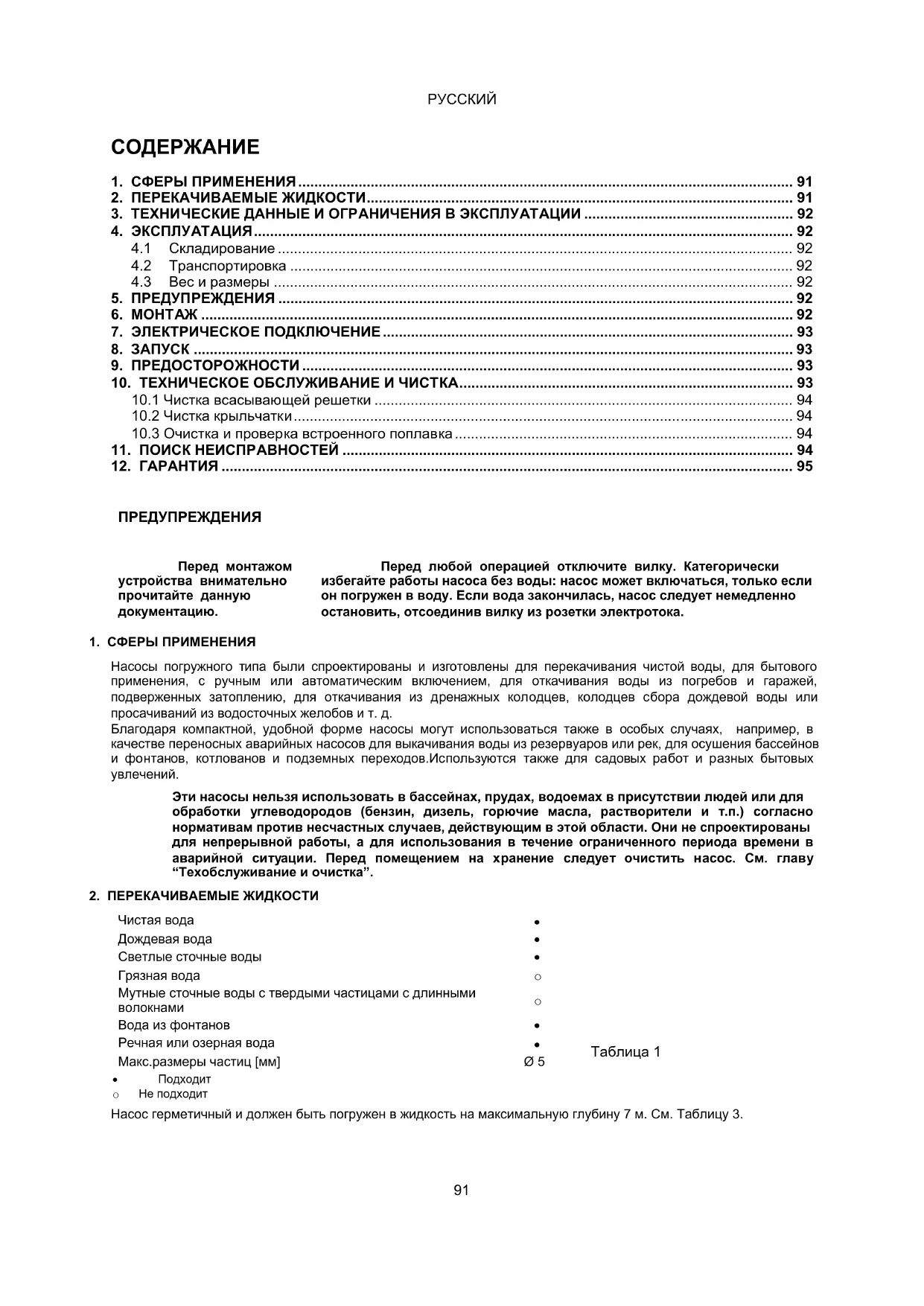 Насос герметичный и должен быть погружен в жидкость на максимальную глубину 7 м. См. Таблицу 3. Таблица 1РУССКИЙ