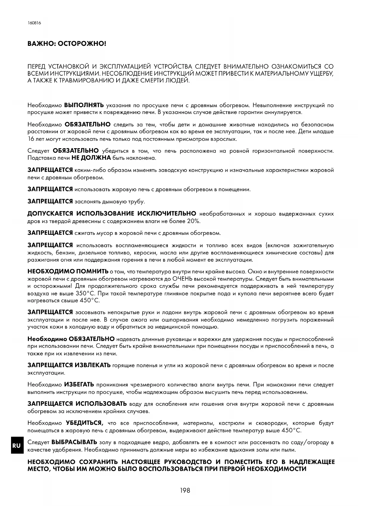 ВАЖНО: ОСТОРОЖНО! ПЕРЕД УСТАНОВКОЙ И ЭКСПЛУАТАЦИЕЙ УСТРОЙСТВА СЛЕДУЕТ ВНИМАТЕЛЬНО ОЗНАКОМИТЬСЯ СО ВСЕМИ ИНСТРУКЦИЯМИ НЕСОБЛЮДЕНИЕ ИНСТРУКЦИЙ МОЖЕТ ПРИВЕСТИ К МАТЕРИАЛЬНОМУ УЩЕРБУ, А ТАКЖЕ К ТРАВМИРОВАНИЮ И ДАЖЕ СМЕРТИ ЛЮДЕЙ Необходимо ВЫПОЛНЯТЬ указания по просушке печи с дровяным обогревом Невыполнение инструкций по просушке может привести к повреждению печи В указанном случае действие гарантии аннулируется Необходимо ОБЯЗАТЕЛЬНО следить за тем, чтобы дети и домашние животные находились на безопасном расстоянии от жаровой печи с дровяным обогревом как во время ее эксплуатации, так и после нее Дети младше 16лет могут использовать печь только под постоянным присмотром взрослых Следует ОБЯЗАТЕЛЬНО убедиться в том, что печь расположена на ровной горизонтальной поверхности Подставка печи НЕ ДОЛЖНА быть наклонена ЗАПРЕЩАЕТСЯ каким-либо образом изменять заводскую конструкцию и изначальные характеристики жаровой печи с дровяным обогревом ЗАПРЕЩАЕТСЯ использовать жаровую печь с дровяным обогревом в помещении ЗАПРЕЩАЕТСЯ заслонять дымовую трубу ДОПУСКАЕТСЯ ИСПОЛЬЗОВАНИЕ ИСКЛЮЧИТЕЛЬНО необработанных и хорошо выдержанных сухих дров из твердой древесины с содержанием влаги не более 20% ЗАПРЕЩАЕТСЯ сжигать мусор в жаровой печи с дровяным обогревом ЗАПРЕЩАЕТСЯ использовать воспламеняющиеся жидкости и топливо всех видов (включая зажигательную жидкость, бензин, дизельное топливо, керосин, масла или другие воспламеняющиеся химические составы) для разжигания огня или поддержания горения в печи в любой момент ее эксплуатации НЕОБХОДИМО ПОМНИТЬ о том, что температура внутри печи крайне высока Окно и внутренние поверхности жаровой печи с дровяным обогревом нагреваются до ОЧЕНЬ высокой температуры Следует быть внимательными и осторожными! Для продолжительного срока службы печи рекомендуется поддерживать в ней температуру воздуха не выше 350°C При такой температуре глиняное покрытие пода и купола печи вероятнее всего будет нагреваться свыше 450°C ЗАПРЕЩАЕТСЯ засовывать непокрытые руки и ладони внутрь жаровой печи с дровяным обогревом во время эксплуатации и после нее В случае ожога или ошпаривания необходимо немедленно погрузить пораженный участок кожи в холодную воду и обратиться за медицинской помощью Необходимо ОБЯЗАТЕЛЬНО надевать длинные рукавицы и варежки для удержания посуды и приспособлений при использовании печи Следует быть крайне внимательными при помещении посуды и приспособлений в печь, а также при их извлечении из печи ЗАПРЕЩАЕТСЯ ИЗВЛЕКАТЬ горящие поленья и угли из жаровой печи с дровяным обогревом во время и после эксплуатации Необходимо ИЗБЕГАТЬ проникания чрезмерного количества влаги внутрь печи При намокании печи следует выполнить инструкции по просушке, чтобы надлежащим образом высушить печь перед использованием ЗАПРЕЩАЕТСЯ ИСПОЛЬЗОВАТЬ воду для ослабления или гашения огня внутри жаровой печи с дровяным обогревом за исключением крайних случаев Необходимо УБЕДИТЬСЯ, что все приспособления, материалы, кастрюли и сковородки, которые будут помещаться в жаровую печь с дровяным обогревом, выдерживают действие температур выше 450°C Следует ВЫБРАСЫВАТЬ золу в подходящее ведро, добавлять ее в компост или рассеивать по саду/огороду в качестве удобрения Необходимо принимать должные меры во 